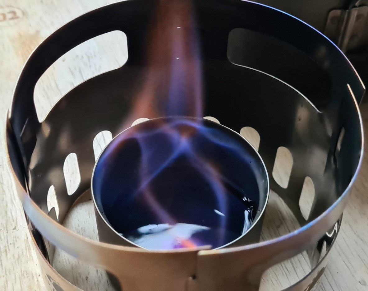 The Toaks stove is poorly named. It isn’t a stove. A stove should be able to support a pot or pan as well as act as a burner. The Siphon requires a separate pot support. Nor does it siphon fuel. Instead, liquid alcohol is drawn up between the two thin walls of the burner by capillary action. These walls are less than 1mm apart and culminate in a lip around the top rim that has eight holes in it. These act as jets for the flames, that have an inward pointing vortex, concentrating the burn in a narrower flame pattern than you might think likely. While this means that a narrow pot can be used with this burner, alcohol requires careful thought as to the complementary parts of a cook kit that must capture all those precious BTUs from what is a relatively inefficient fuel. This means a windshield, an optimum distance between jets and cooking vessel, a wider pan rather than narrower pot and a lid to the pan. This then moves me away from my little open-top titanium cup that I usually include in day walk brew kits and returns me to my favoured wide 900ml pan that I use on multi-day hikes.