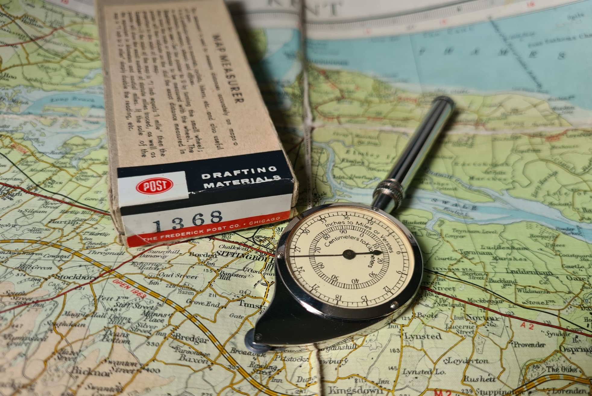 Almost all of ‘their’ products were rebranded items manufactured elsewhere. For example, their many slide rule models originated from American, German and Japanese manufacturers. It is not clear what factory manufactured this month’s map measure, however the rear of the case indicates that it was made in Germany sometime in the mid-twentieth century. As to whether it is a pre or post-war production measure, is a mystery.