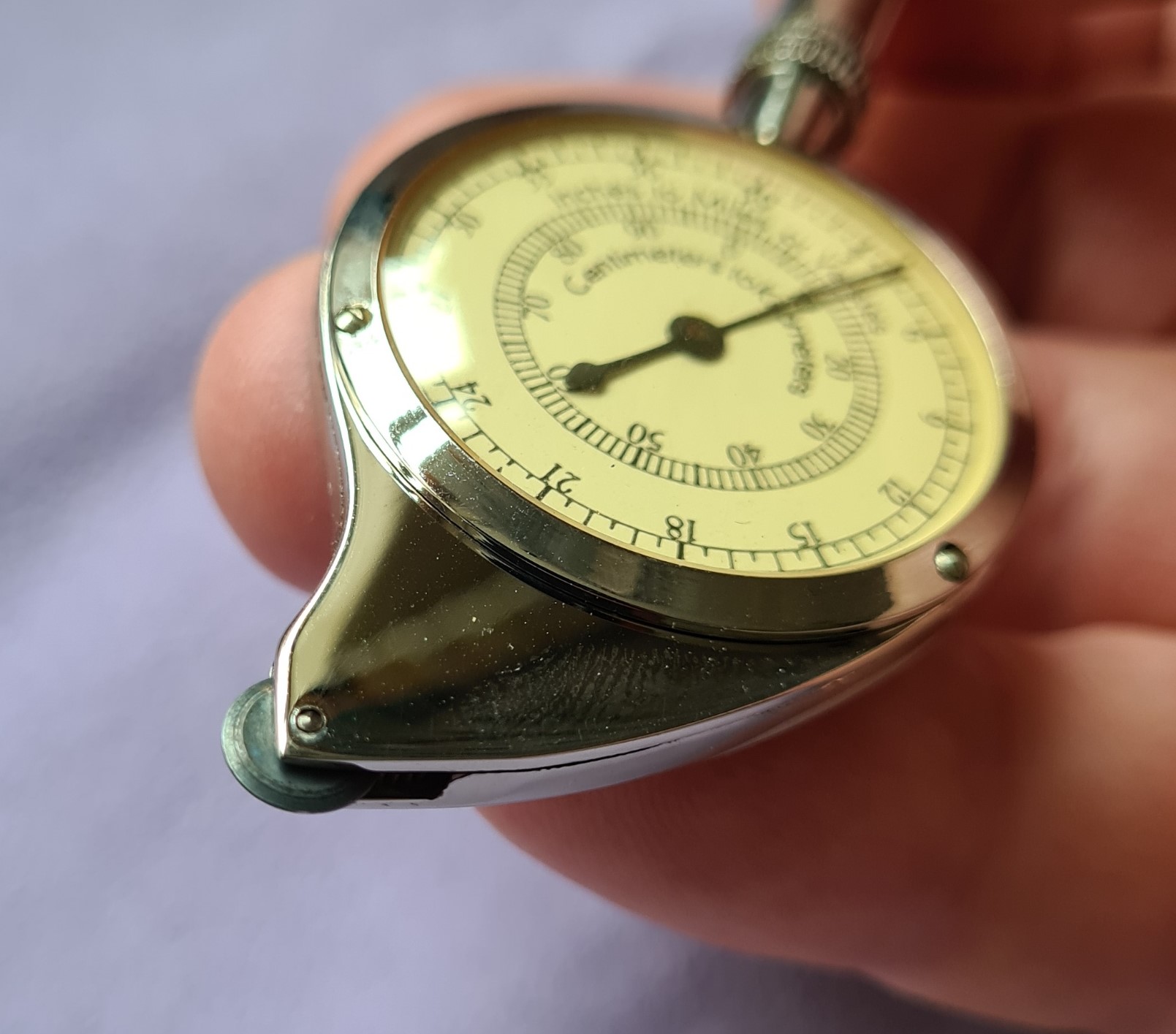 I have another example of this measure in my collection and it has subtle differences. None of which are particularly important. The dimensions of the two examples differ. The smaller is 110mm x 35mm x 7.9mm while the larger is only marginally larger: 112mm x 35mm x 8.15mm. The length difference is a result of a longer handle sleeve on one measure as the case dimensions remain the same, other than a domed crystal that stands very slightly more proud. The size of grub screw on the handle differs, the (presumed) earlier example has a quite tiny screw that is very difficult to replace once removed. The larger screw is much easier. The font is also different on the dial face. It is interesting that only one of the measures has the country of origin ‘GERMANY’ on the dial. Were paper dials replaced or simplified because the country the measure was being sold in was, or had recently been, at war with the country where it had been manufactured?