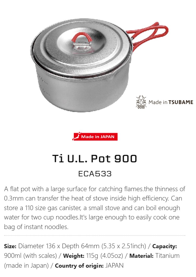 The Japanese made titanium pan has clear 300ml and 600ml graduations and a pour spout. The lid fits well, nestling into a recess rather than being a tight press fit. Evernew do make periodic changes to this pan and model numbers change but as far as I can see it is just to the colour of the lettering on the lid. There is also a non-stick version available but I don’t want that. The pan itself weighs 80.4g and the lid a further 29.3g, 109.7g (110g) in total.