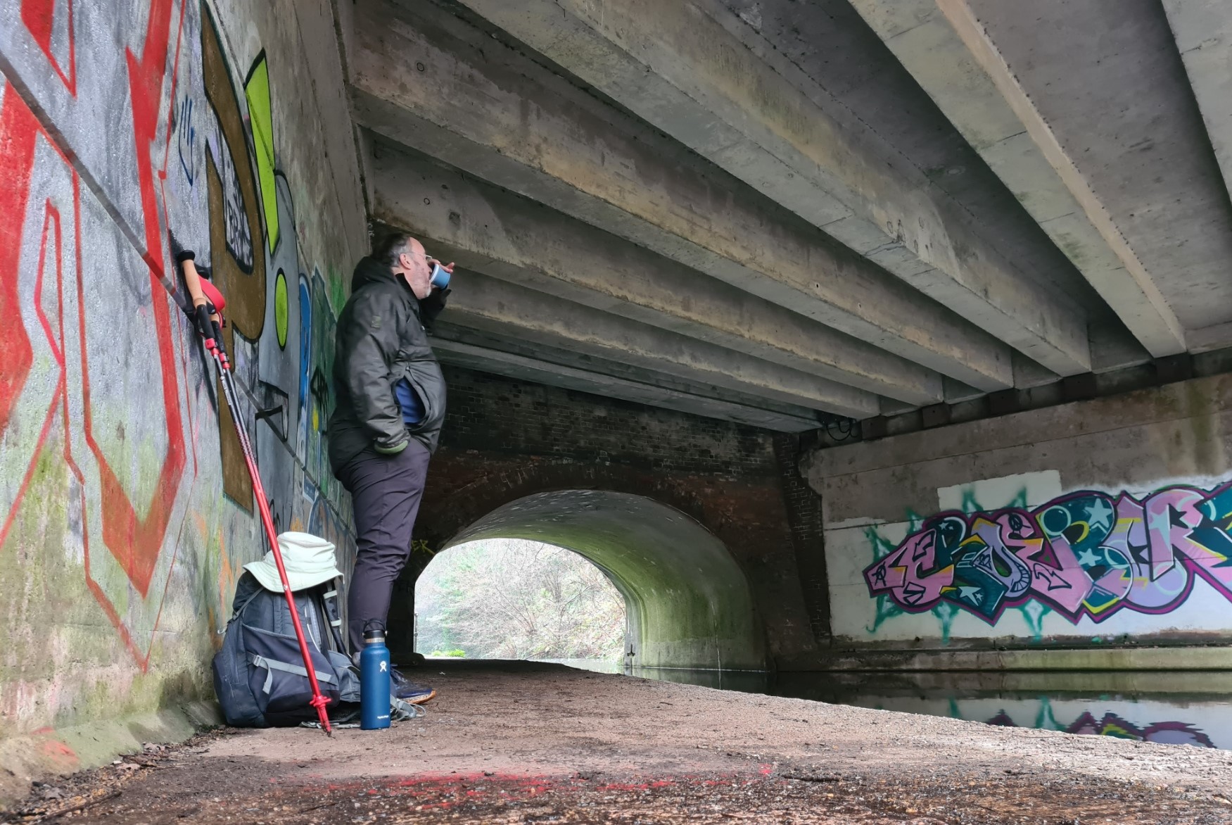 Sheltering beneath a road bridge for a cup of tea
