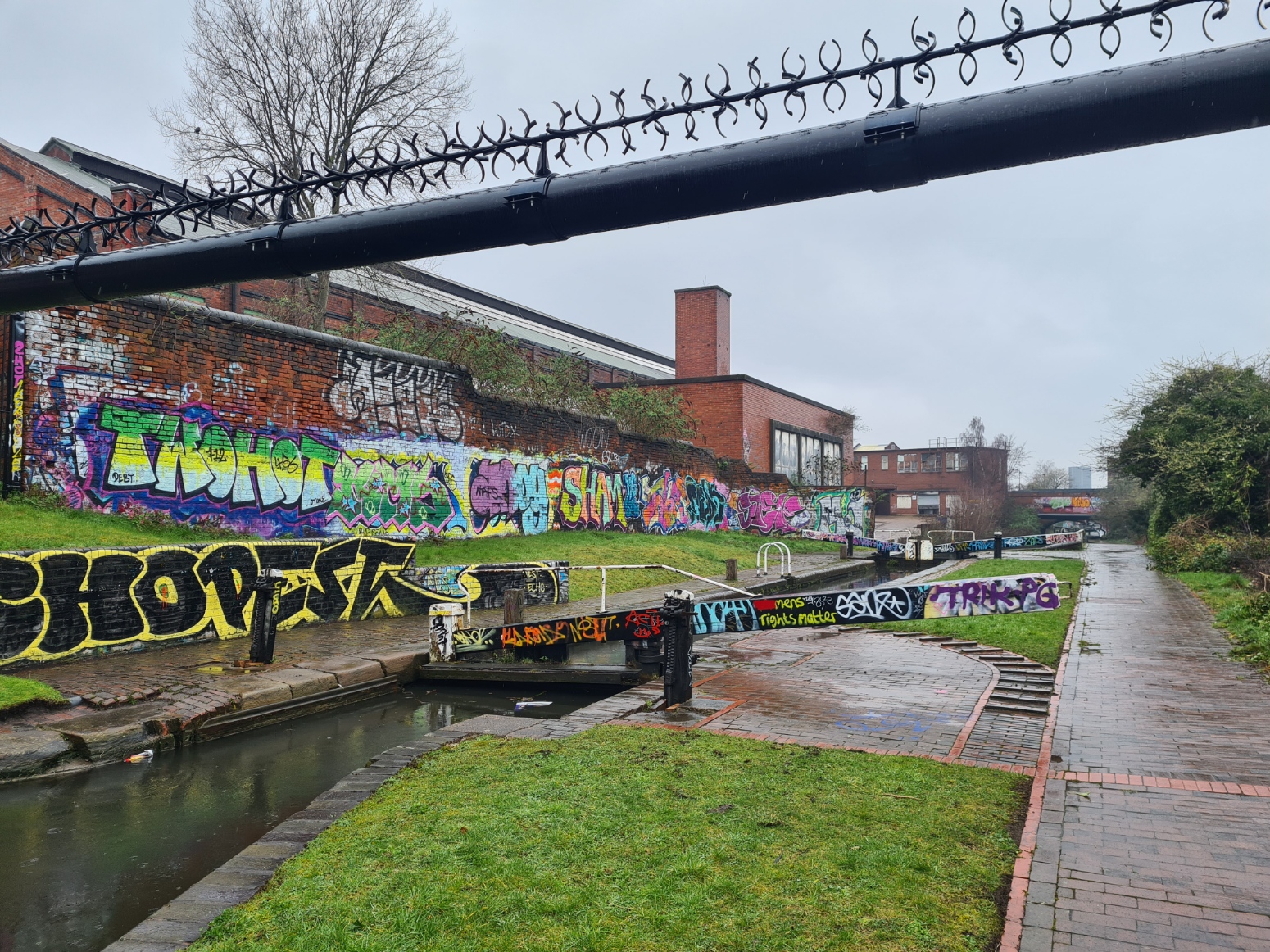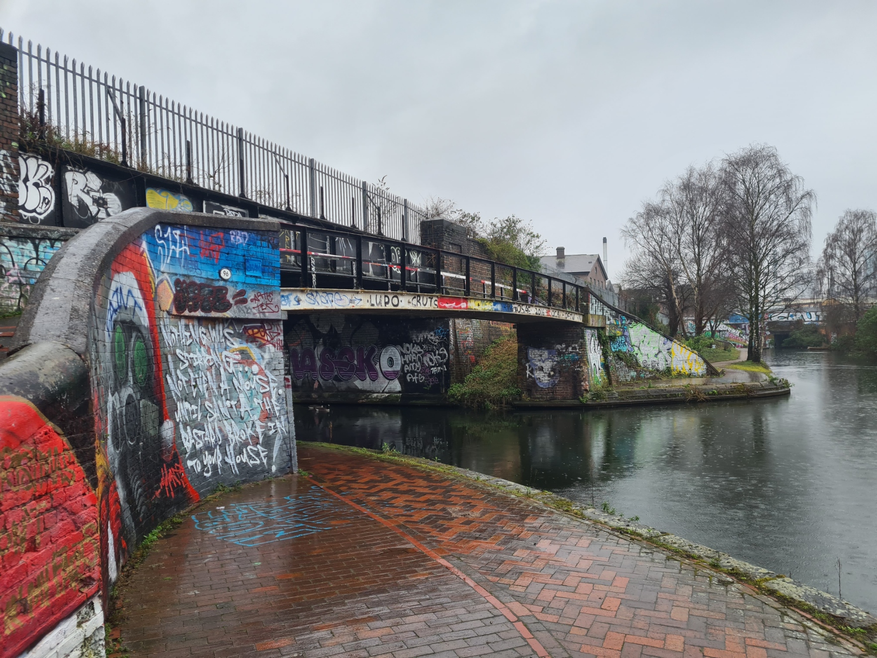 The amount of rubbish increased the nearer I got to Birmingham. It was a bit of a shock after a couple of days of cleaner canal. I spent the miles identifying the favoured debris- cheap cans of lager, equally as cheap strong cider, exhausted aerosol cans bobbing in the cut. I attempted to read the spray-painted tags beneath the bridges, but as usual failed. I took shelter under one dripping bridge for a hot tea from the flask, beneath another for my poor cheese and onion sandwich from yesterday.