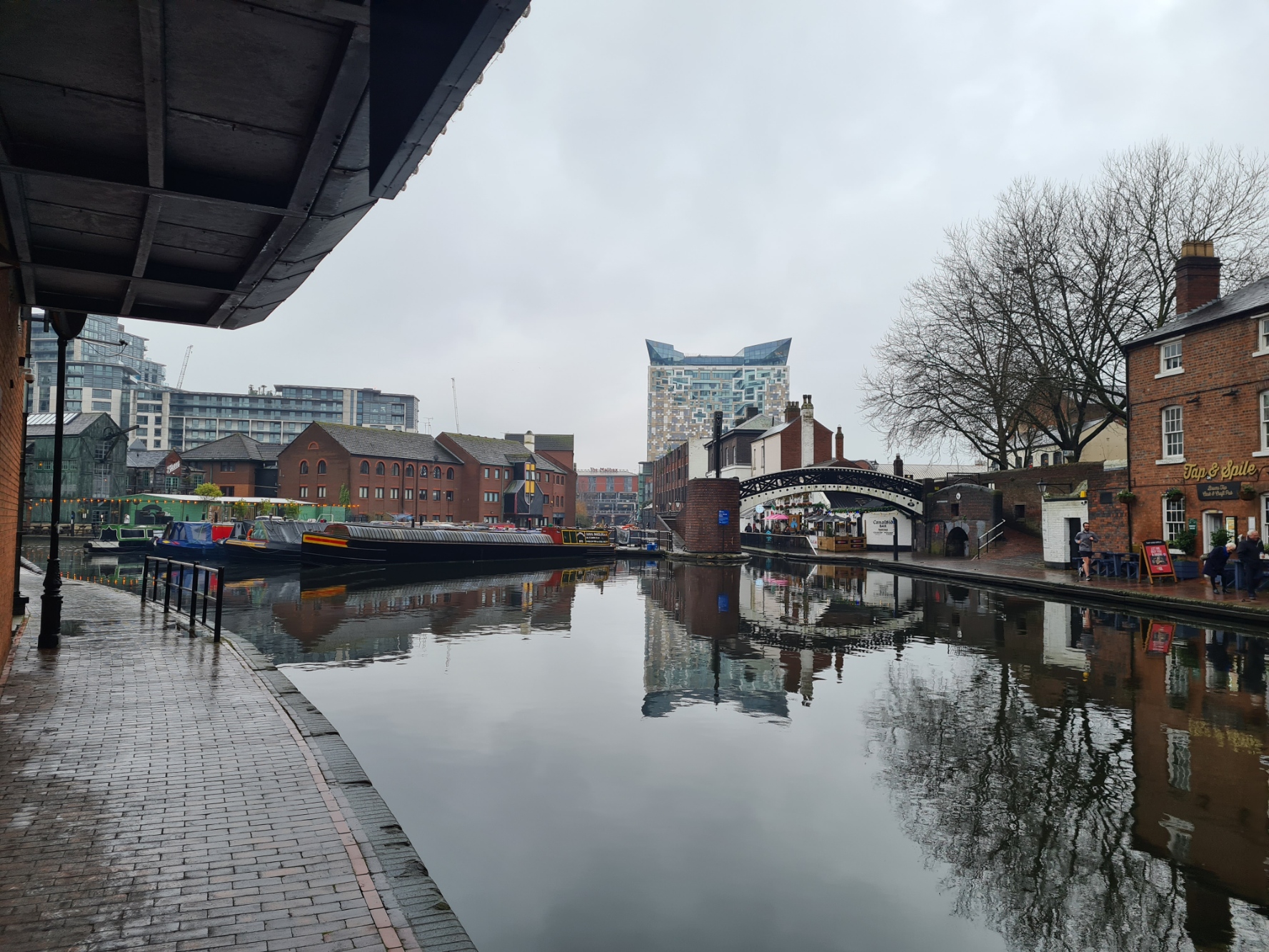 Once I had changed onto the Birmingham & Fazeley Canal, leading into the city centre, it all changed. The vibe was altered. There was life and vibrancy. People were out in their droves, despite the persisting drizzle. The canal towpath was now a preferred connecting walkway. Pubs and cafés abounded. The boarded up properties passed earlier were replaced by active retail and places of work instead. Places that actually looked as though they might be OK to visit or hang around. The canal however, was now simply a place of interest. It’s essential role as an arterial trade route has long passed and it is now simply a recreational and historical anomaly, but no less essential because of that.