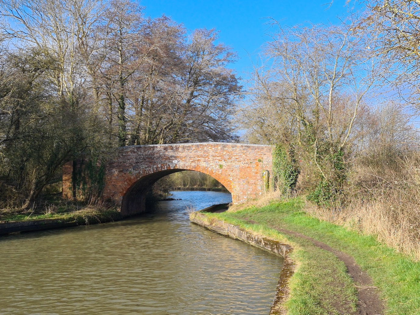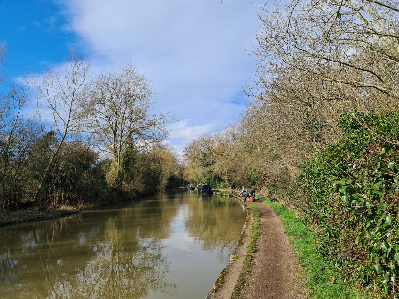As usual, I slept well, but I was a bit peeved at having to get up earlier than I would have preferred, not only because a long day beckoned, but also to clean the large Airbnb premises a bit prior to leaving. I was away for seven . While the small Josie’s Cafe across the forecourt was open, I decided to crack on with some miles instead. Initially, a walk through town, along lanes and country paths, field edges and woodland, skirting a fishing lake, before returning to the canal. After the mostly poor walking underfoot over the previous couple of days, I was rewarded today by a good 98% of easy towpath walking. It was a Saturday, so the towpath was quite busy with joggers, dog walkers, cyclists, and fishermen. A few boats were on the move too, gently and slowly chugging past me. The sun shone. A bright Brimstone, my first of the year, fluttered down the path toward me. Primroses and Daffodils at my feet, I decided it was going to be a good day.
