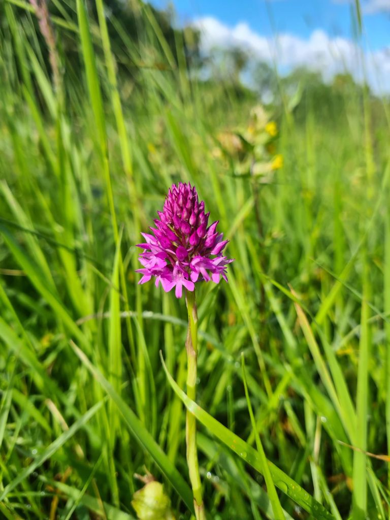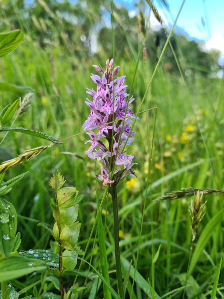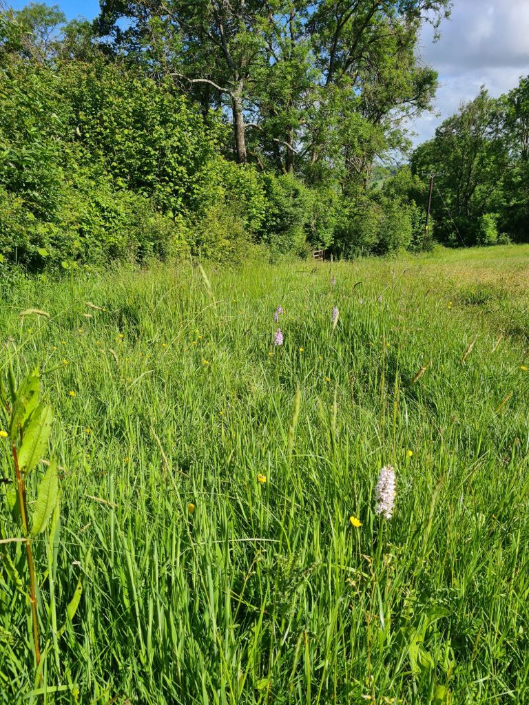 It is straight into a one in five climb, fortunately only for a kilometre, then we emerged from the shady path to sun splashed orchid besplattered grass meadows.