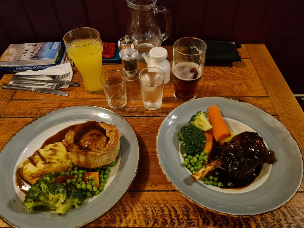 We are staying at the eighteenth century Royal George hotel tonight. This is in the centre of Birdlip (the curious name simply means ‘steep place’) a natural end to this section. Mrs TPOTC has a sore knee from the climbs and drops, so I volunteered to immediately visit the bar to get ice. It seemed only polite to have a pint of Green King IPA while I was there. There is no need for us to venture out again for an evening meal as the hotel has a decent menu, so we had pre-booked a table for 19.45