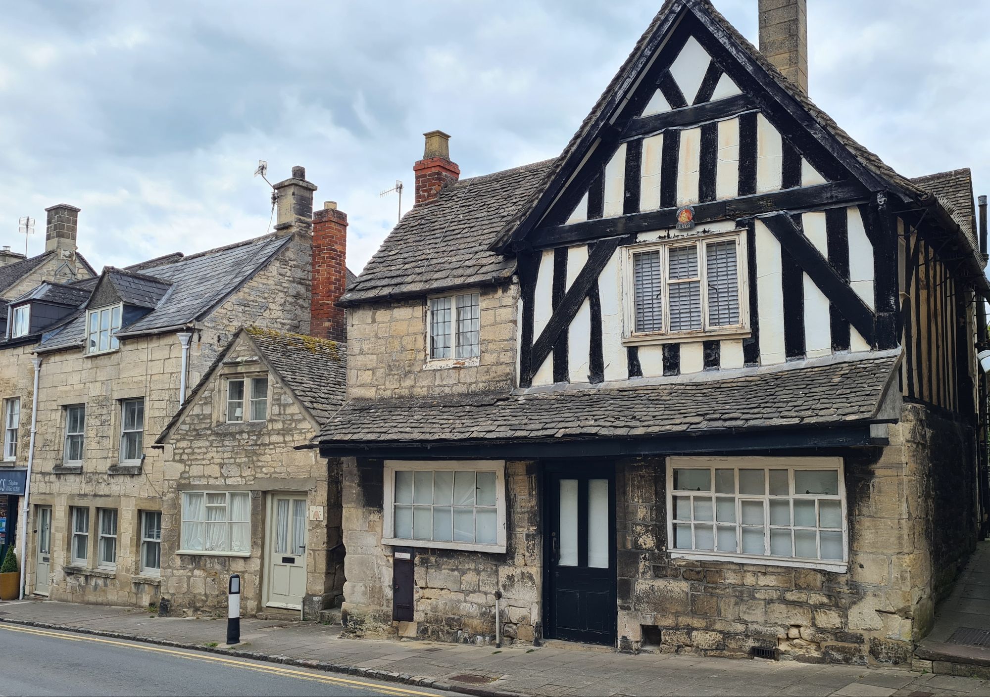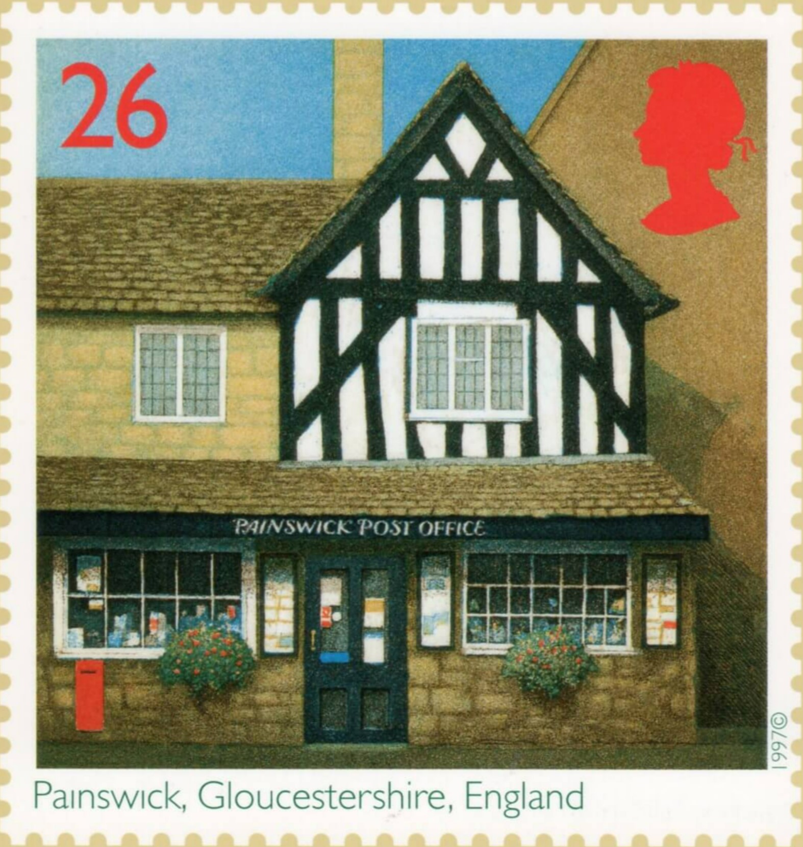 After passing through so many villages built of the gorgeous honey-coloured local stone, the old market town of Painswick, ‘the Queen of the Cotswolds’, was a bit of a surprise as many of the buildings in this former cloth trading town are made from a light grey coloured stone. The Cotswold rock that so many buildings and walls are built from is mainly an oolitic limestone, sediments slowly, ever so slowly, formed during the Jurassic era. The deep honey-coloured stone is most prevalent in the north of the Cotswolds, getting paler the further south. We had noticed that the Royal George, last night’s overnighter, was similarly constructed from this paler stone. Though the image of the old post office on a 1997 Royal Mail stamp seems to have been altered to show the more honeyed colour.