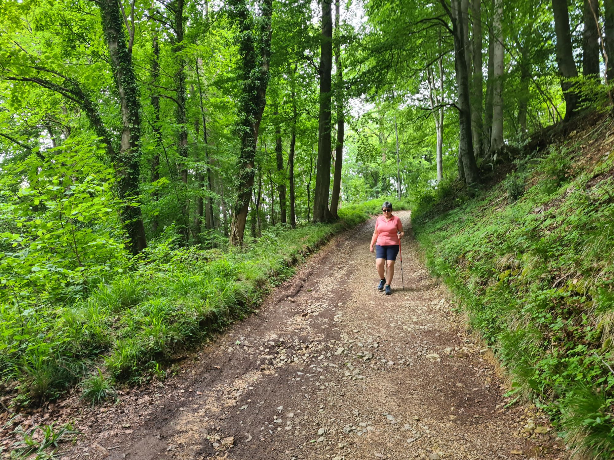 This day is consistently good and almost the same for the entire section until nearing Painswick- following the escarpment, ups and downs, many quite steep, interspersed with delightful easy walking. For the first couple of miles it was often slow going. A farmer had been using the wide ride to access his field further along and his tractor had torn up an already muddy track. Beyond that, it was fine. The sun shone down through the beech slopes, shafts of light, ferns bracketed the trail, moss covered the ancient crumbling dry stone walls, birdsong, rattling of woodpeckers, the shuffle of trail shoes through beechmast, heavy laboured breathing on the steeper sections, chatter between the two of us, it was a joy to be here.