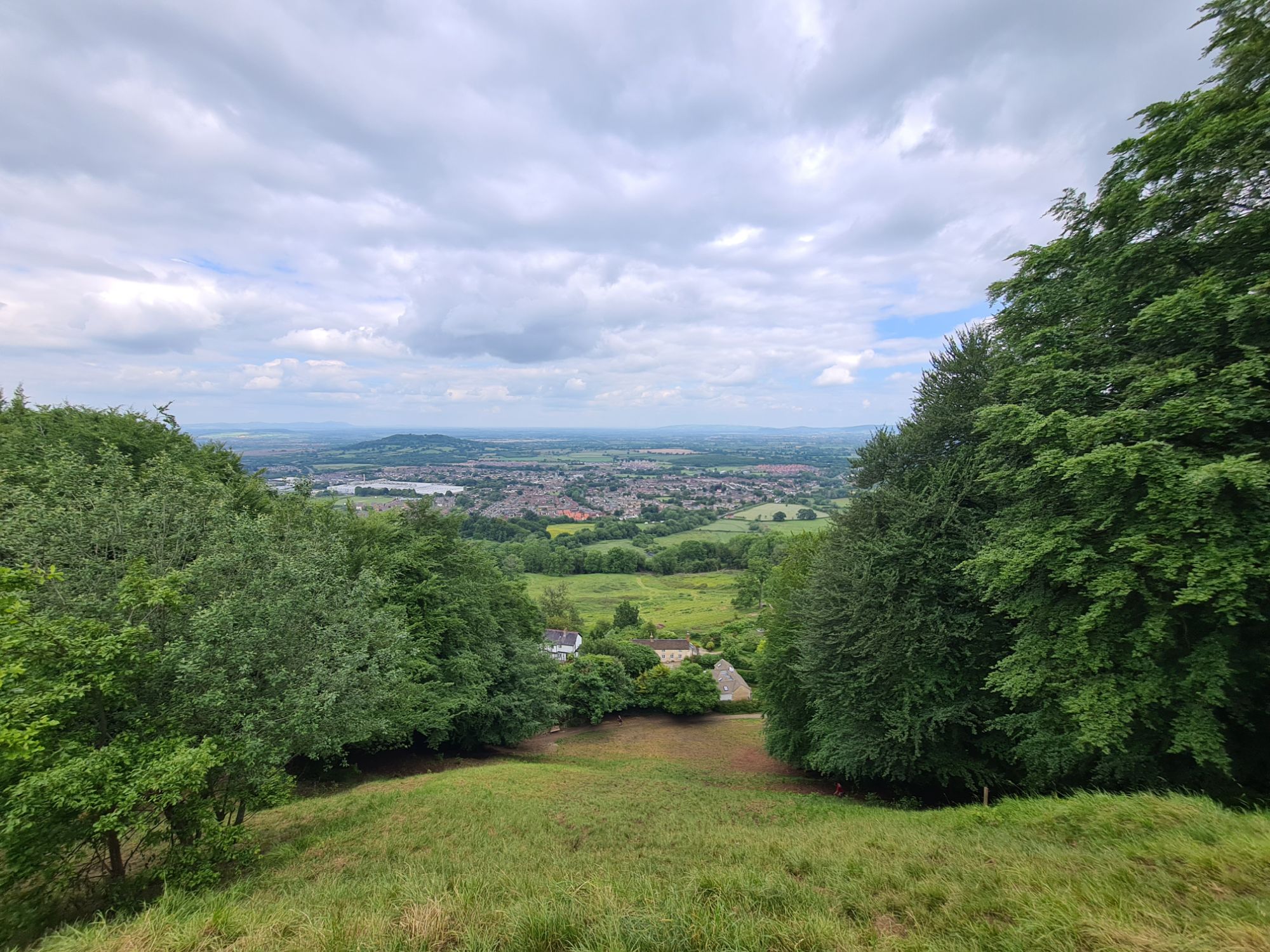 The trail walks along the bottom of Cooper’s Hill, loops round and labour’s up to the top. I was a little surprised at how small the exposed hill is, hemmed in by trees. This is the location of that most eccentric of annual festivals, the cheese rolling. Each year, in defiance of official disapproval, thousands somehow squeeze in and around here to watch the foolhardy hurtle down the stupidly steep concave slope in pursuit of a mock cheese.