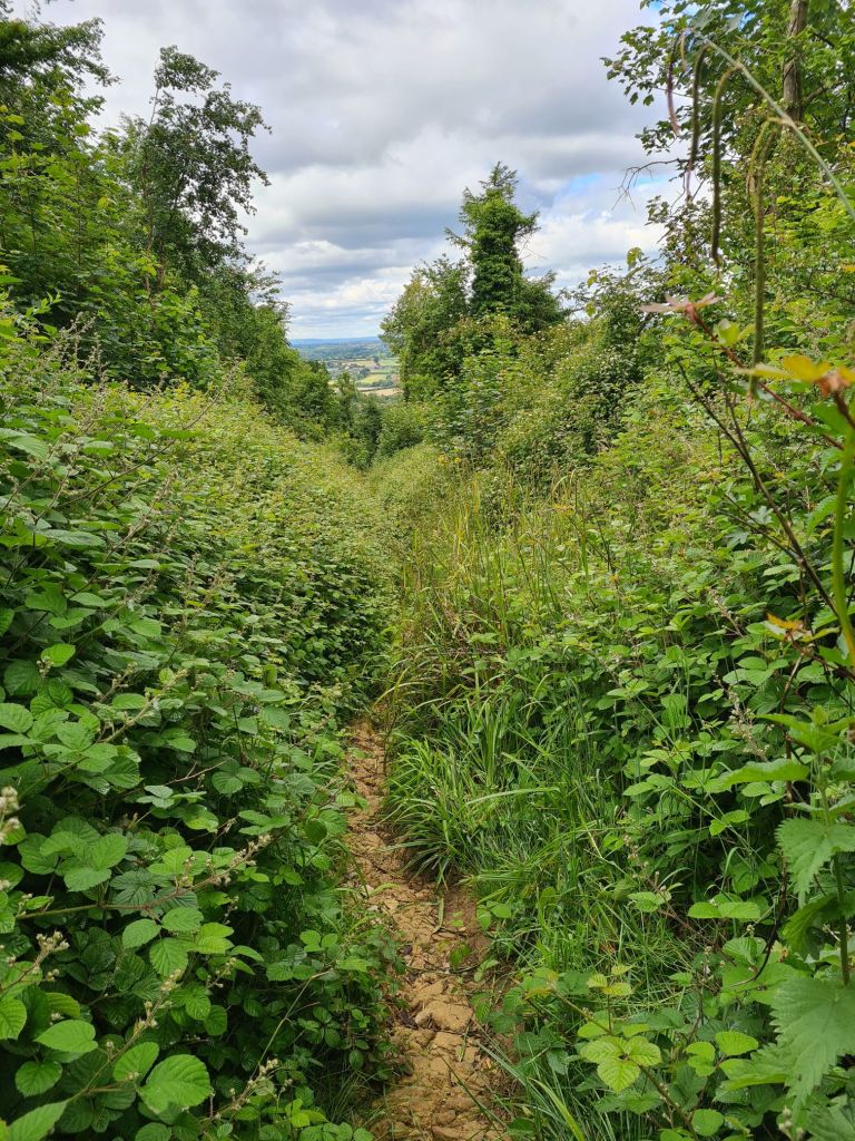 It was to be another day of remarkable place names. But prior to those, it was the usual climb out of town. I reckon this is the steepest longest climb of the trail, but- one foot in front of the other- it is a simple climb. Then simple field edge walking along our last remnants of the obvious escarpment before a steep rock clattering descent into Wortley ( barely seen) and easy walk to Alderley (likewise). It had rained hard last night, but briefly. The rain sat in pools on the path, some requiring careful circumnavigating. Wortley is recognised as the birthplace of Stephen Hopkins. He made his fortune in the local cloth trade and sailed to America with the Pilgrim Fathers in 1620.