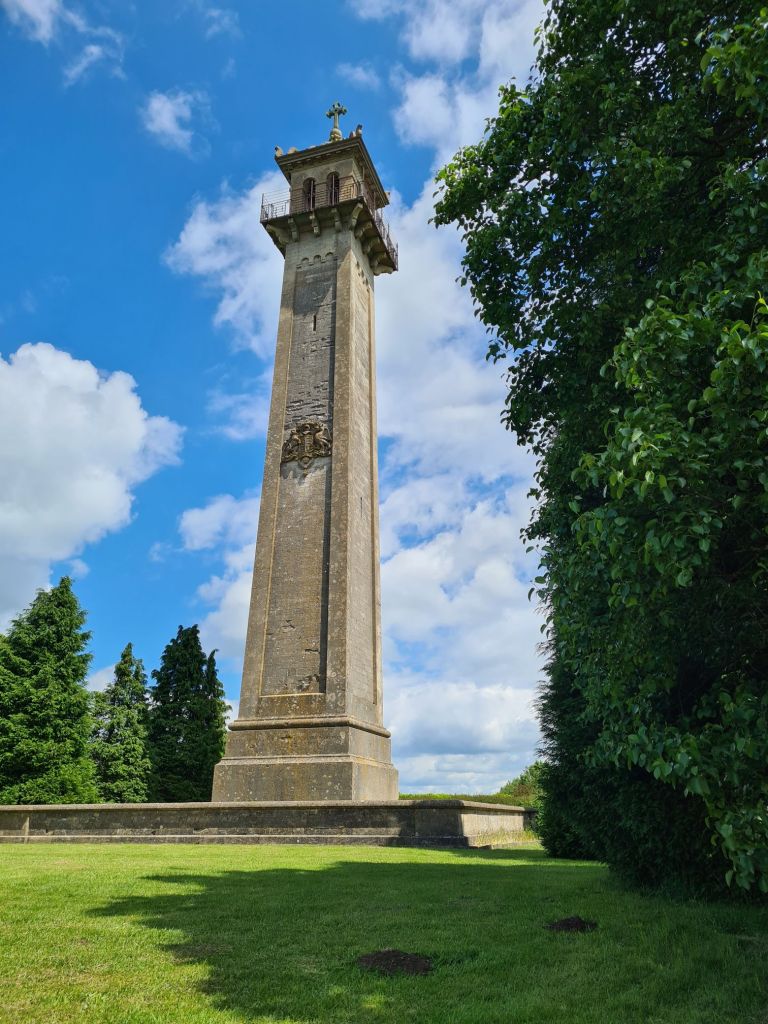 We stopped to chat to a lovely old boy. He is a Highland Cattle breeder that the Highland Cattle Society informs us has bred 84 of his 90 animals. He was busy getting his cows into the crush this afternoon for TB testing. He spoke of his fondness for Albert, a grand looking red coated bull, and sadness that the impressive looking but docile creature now has to move on to another fold. These are the oldest registered breed of cattle in the world and I always like to see them on my travels. A four-wheel drive car pulled up alongside us, his farmer neighbours offering to lend a hand getting the cows down off the hillside. We were simply holding up proceedings, so waved goodbye and walked on, particularly as I had a tower to climb. It is the Somerset Monument. Dating from 1846, this 120 feet plus edifice was erected in memory of General Lord Somerset, who served under Wellington at the battle of Waterloo. There are 144 steps up to a viewing platform and I had been looking forward to climbing them. But it wasn’t to be. The Badminton Estate had banned entry to the grounds around the tower due to “risk of falling masonry.” Then fix the damned thing, instead of barring people.