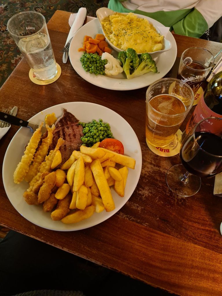 This attractive village pub is over 500 years old and of a type I am particularly fond of, all exposed beams to smack my head on and not too heavily renovated to look ‘oldie worldie’. I was looking forward to not only eating there but also sampling their real ales. Their kitchen isn’t open particularly late so we had booked an earlier table than is our want and settled down to eat at 19.30.