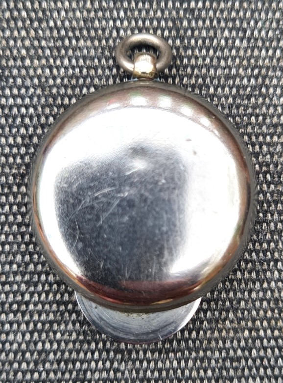 This late nineteenth century instrument could be purchased with a variety of finishes- gilt, nickel, silver plated or gold plated. The instrument case is simple and lacks any decoration. It has a small ring hanger at the top and small pointer over the front of the tracking wheel. When purchased, it came with a small velvet lined, leather-covered wooden snap case, but was intended to accompany its owner, hung from a watch chain, fitting inside a gentleman’s waistcoat pocket. It is lack of protection that has caused the example shown here to suffer so many scratches to the flat surface of the flat crystal.