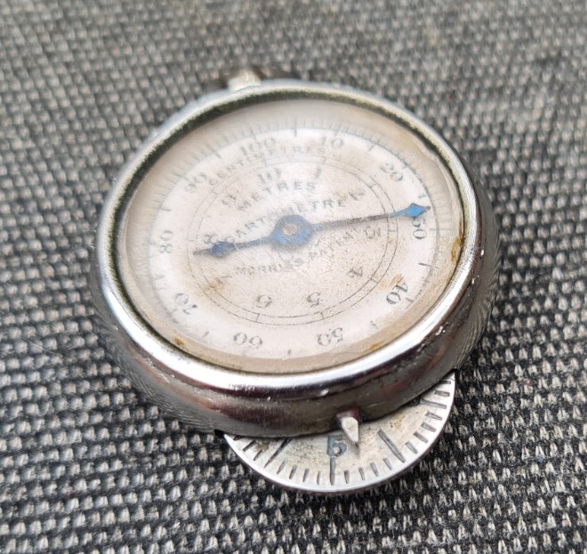 This small instrument will measure lines on maps or anything else, by holding it in the right hand, facing toward you, then wheeling forward. Or in the left hand, facing toward you and wheeling it backward. Despite it’s ‘bijou’ dimensions, it will measure long lines. One complete rotation of the dial by the large hand indicates up to 100 centimetres (one metre) measured, in one centimetre increments. One rotation of the dial advances the small hand to the ‘1’ position on the inner dial. This can indicate up to 10 metres measured. This is a remarkable distance for such a small measure., i.e. one centimetre increments up to 10 metres measured. It is even possible to measure single millimetres with this instrument as the tracking wheel has millimetre increments included. Perhaps unsurprisingly, these tiny increments do not appear on the imperial version of this measure.