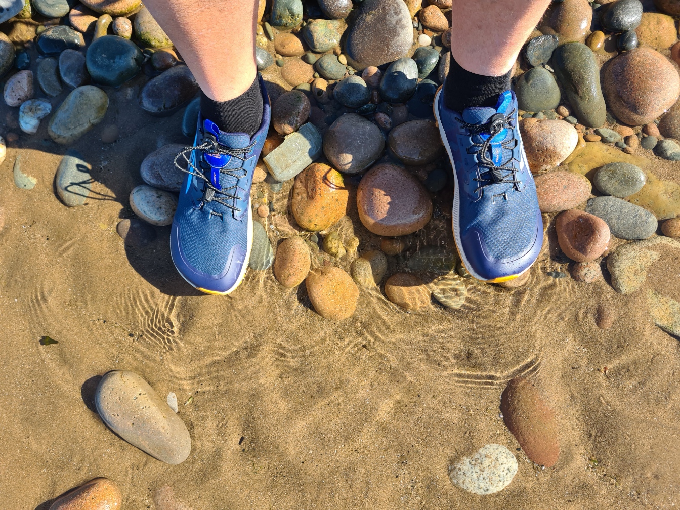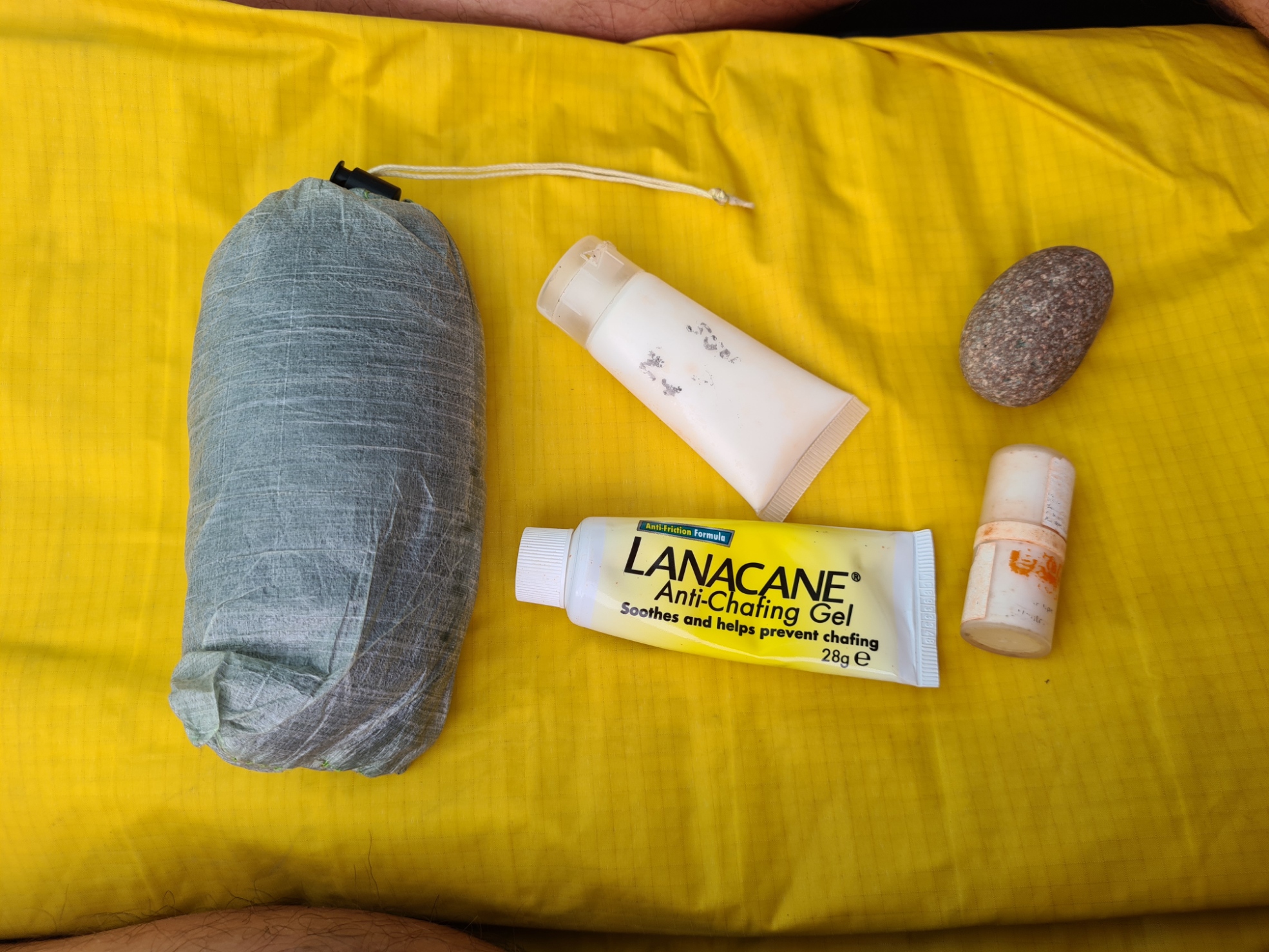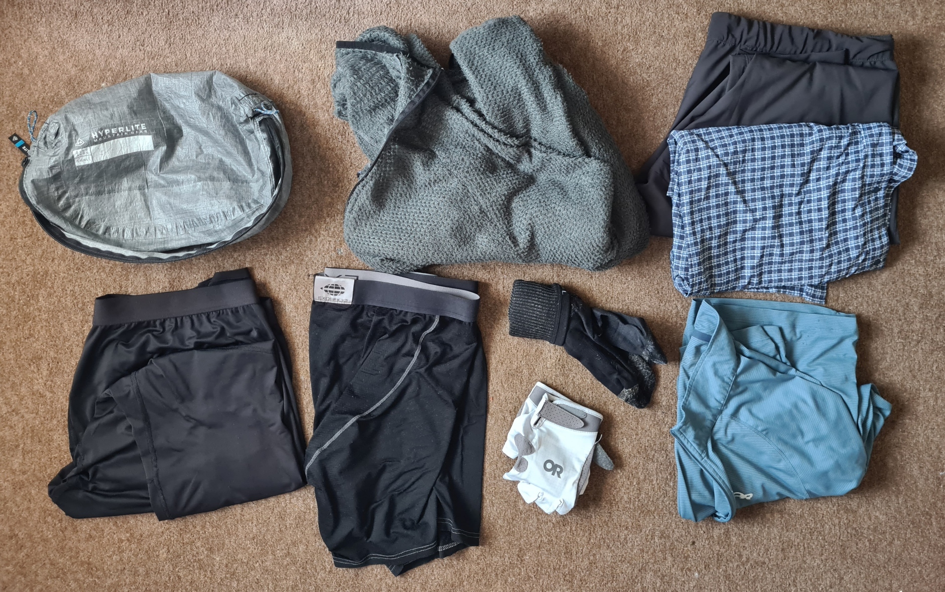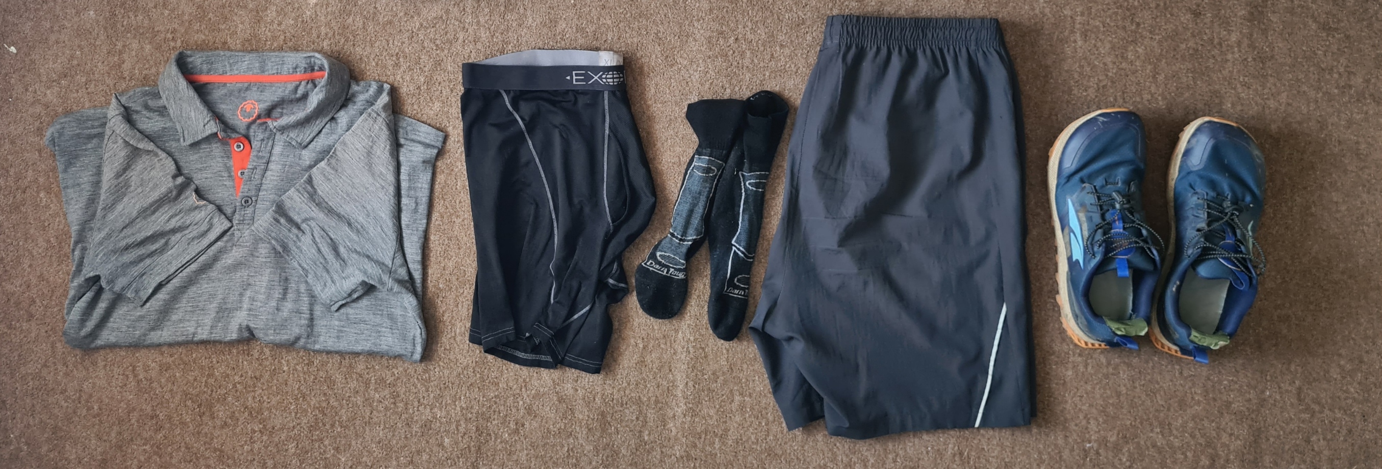 These were my standard clothes worn unless conditions are particularly cold or wet. A lightweight merino polo shirt, synthetic ExOfficio skiddies, that got a wash out in a shower or sink when I could, likewise my sole pair of merino wool walking socks. Shorts were just some cheap synthetic pair off Amazon. The all important footwear was a pair of zero drop Altra Lone Peak 7’s, with standard tie laces replaced by elastic lock laces. This was the only footwear I carried.