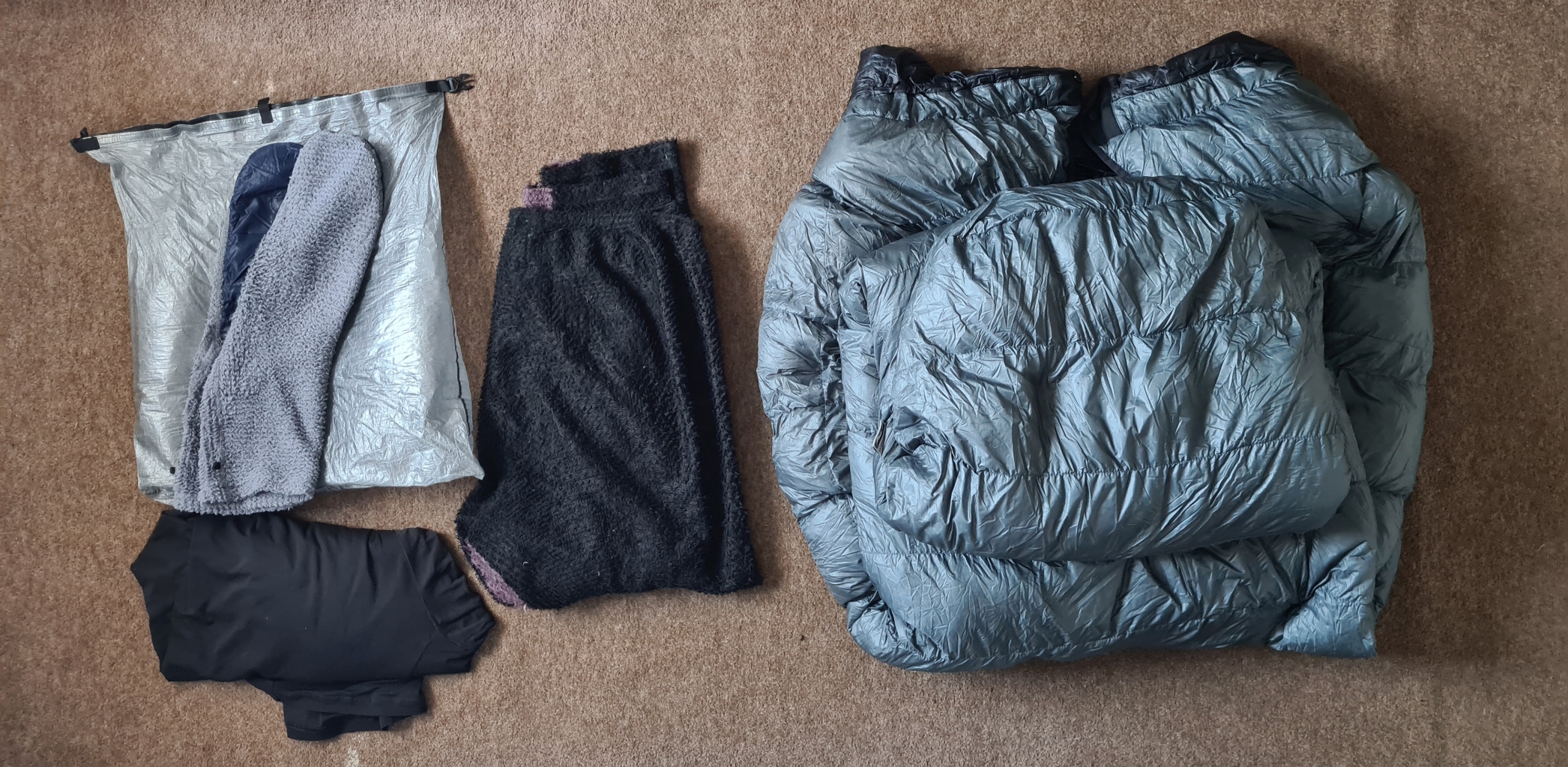 I have two Katabatic quilts and took my lighter weight one, the Palisade, on this trail. This was cosy warm and I was never cold. I use dedicated sleep clothes to keep body oils, salts and grime away from my quilt, these were very light and thin Rohan Ultra silver long sleeve top and Rohan Ultra silver bottoms, plus synthetic OMM Alpha sleep socks. My merino buff is also slipped over my makeshift pillow of a night to make it more comfortable to the face.