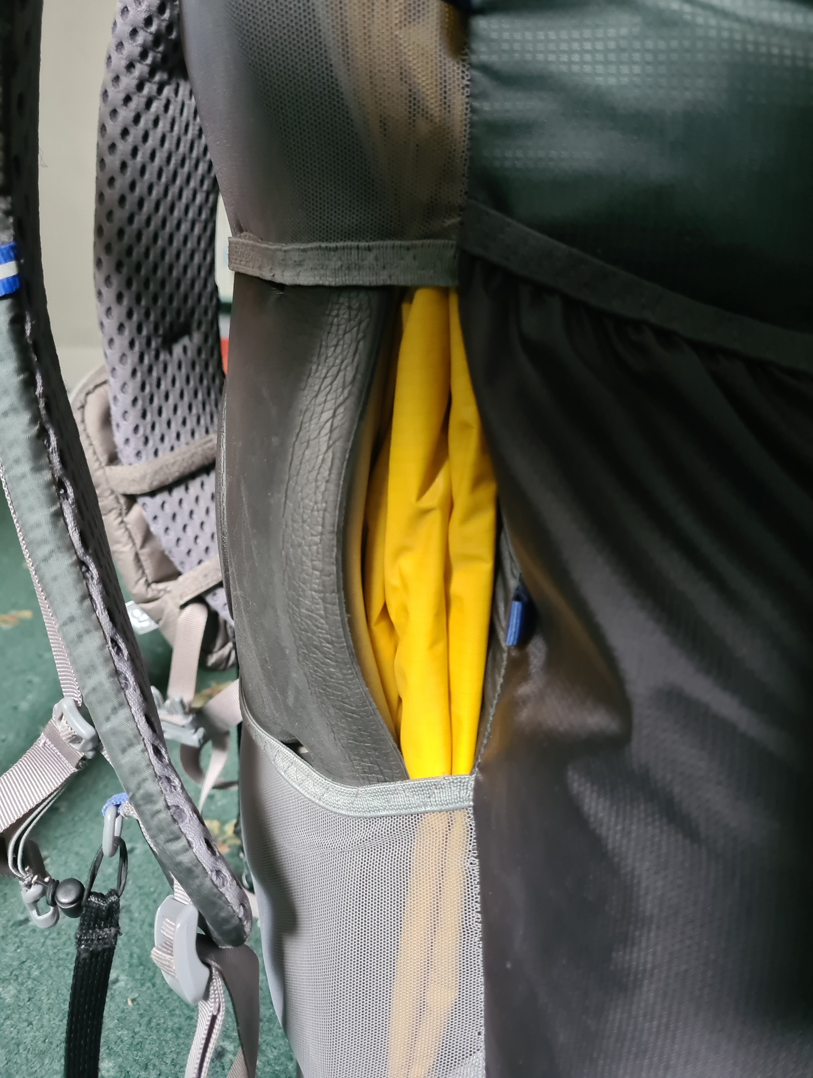 The stretchy front pocket on the Mariposa is where things get stuffed that I might want easy access to. These were usually tent pegs/stakes, poop kit, waterproof jacket and rain skirt, rubbish bag, and wide brim hat