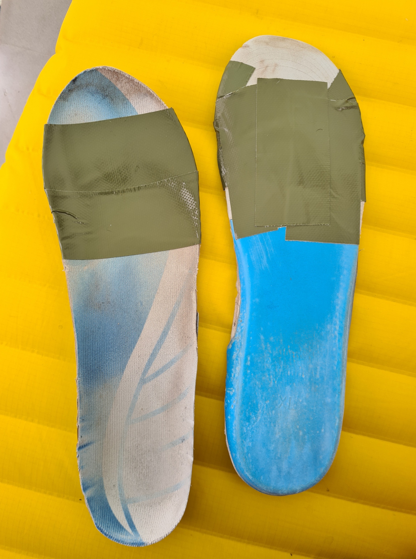I made a mistake with my choice of insole, though I wasn’t to know it. I have been using a pair of Arch Angel insoles, that I purchased at an outdoor show, on all of my hikes for the past year or so. They have been excellent, light, supportive, don’t soak up water and don’t smell as much as stock insoles. However I had obviously reached the end of their life, which is around the six hundred mile mark. I found on steeper descents that their integrity had lapsed, they buckled under the foot, causing a ripple of material under the toes and I could see there was a chance of either blistering or soreness. This was easily remedied. I carry a metre of so of Duct tape wrapped around the shaft of one or both of my hiking poles and I put a couple of turns around the front part of each insole, restoring stiffness and removing the issue. This did me for the duration of the trail and they got chucked at the end of it. It wasn’t a fault of the insoles, I had just pushed them beyond their practical lifespan.
