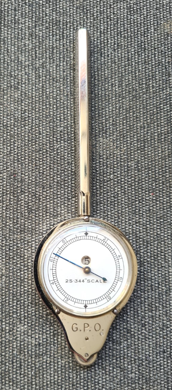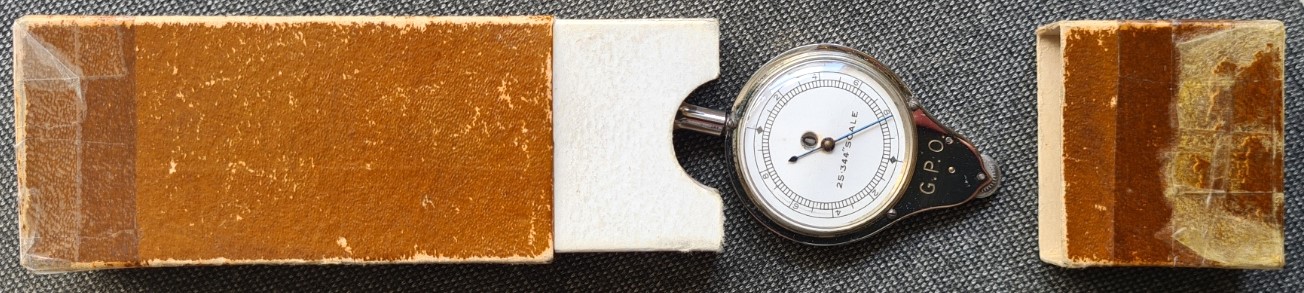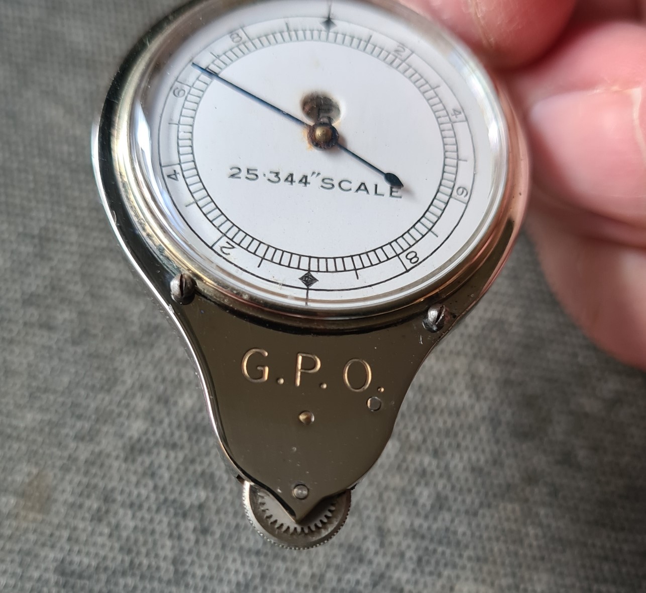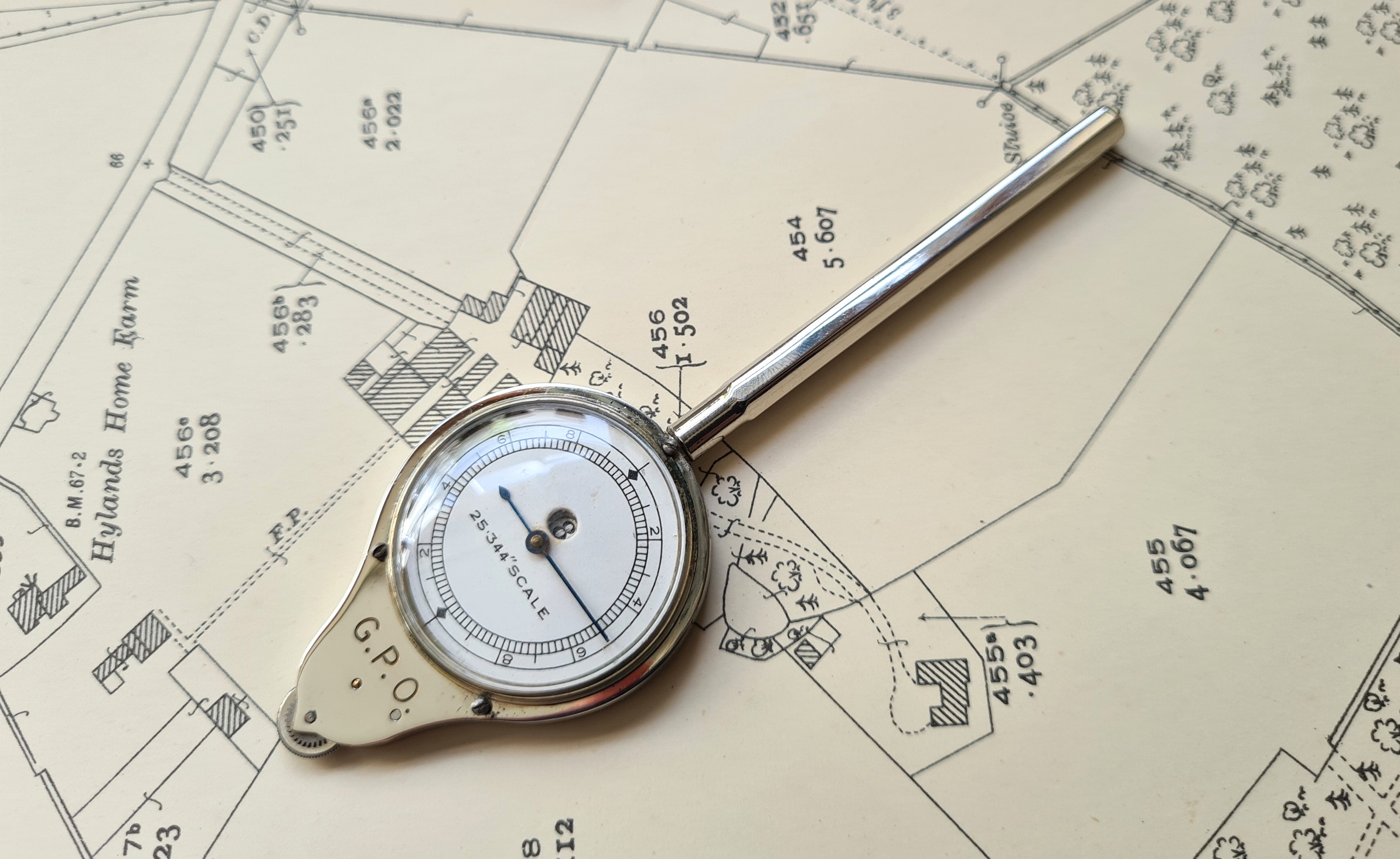 There are three letters stamped on the front of the case that provide a small clue as to the provenance of this particular measure. Below the dial are the letters- ‘G.P.O.‘ which stand for ‘General Post Office’. This was the identity of the British state-owned telecommunications and postal service until 1969. No doubt this particular measure was an official issue and used for measuring the length of postal deliveries or routes to be taken by bicycles or other postal vehicles. These are not the only map measures that have been used by the GPO for these purposes and other examples have also been looked at as Map Measure of the Month. I am sure other models would also have been used.