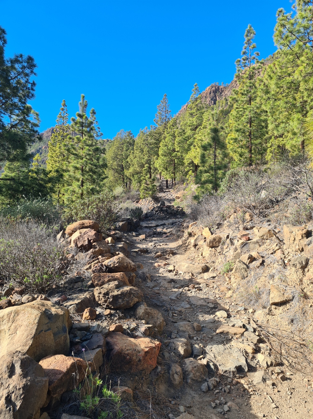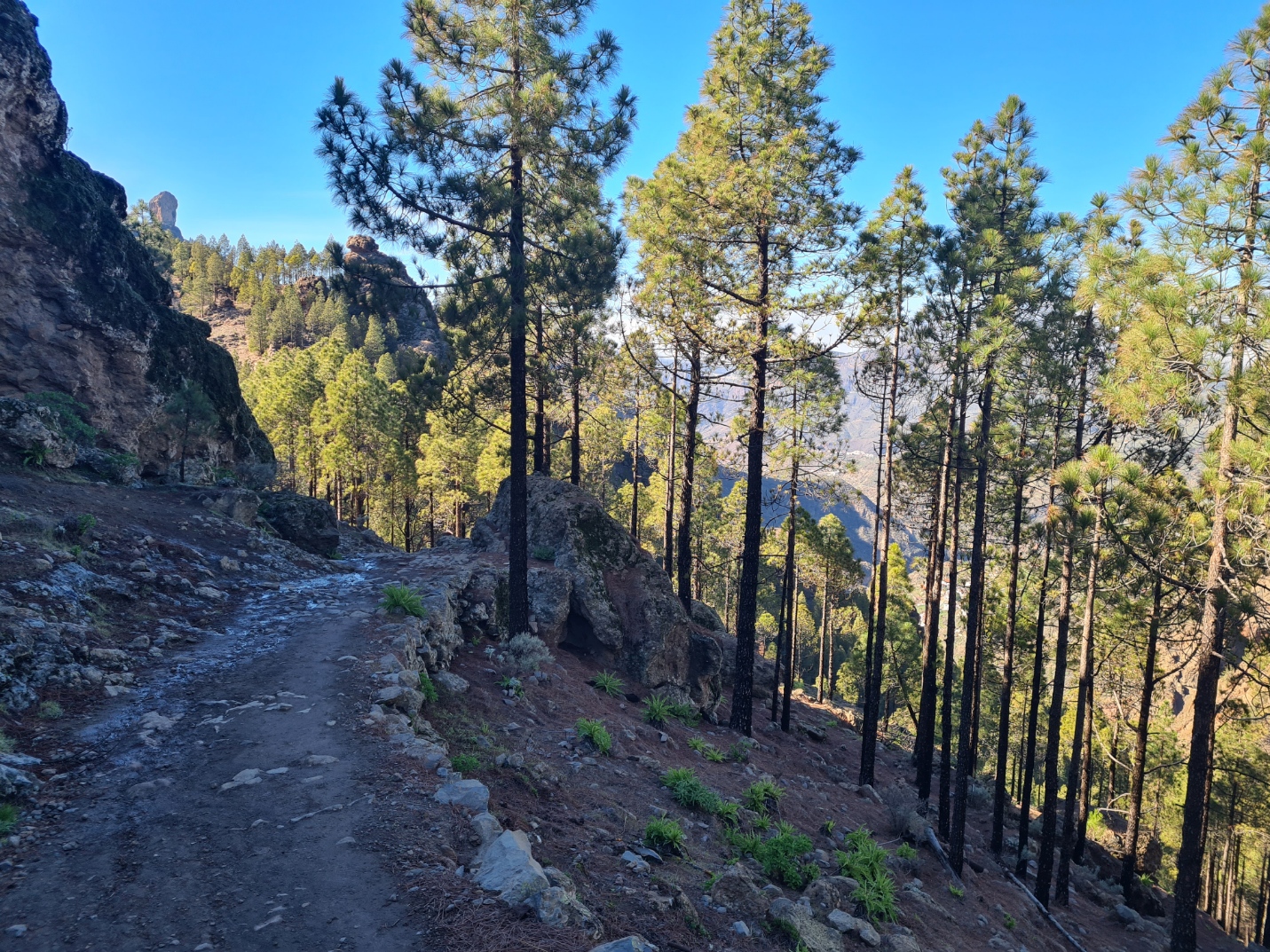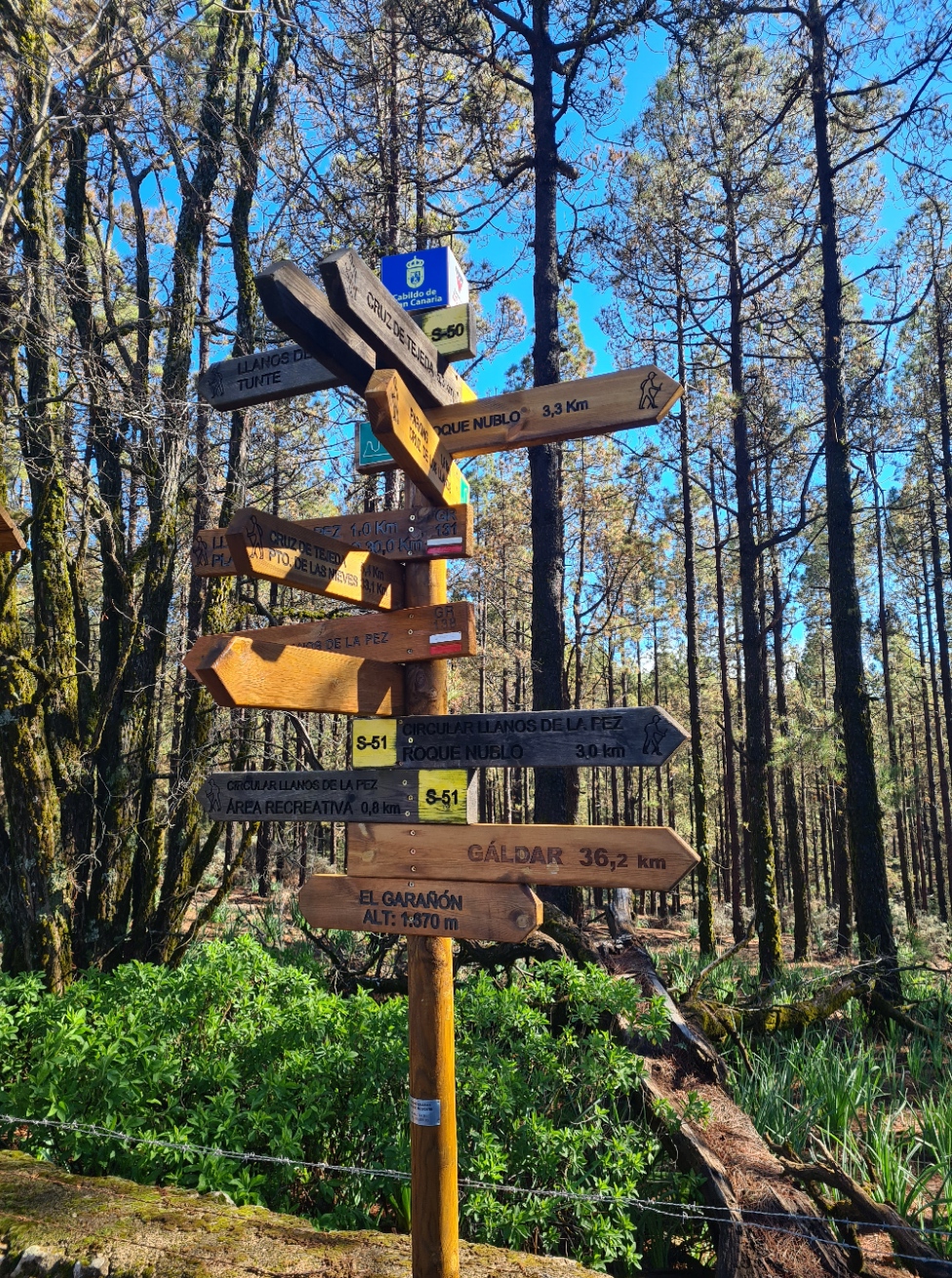 As soon as I had some shade under the pines I stopped for a breather and much needed cool down, hydration and lunch. Also pulling off my shoes to allow protesting feet a little time to air and recover. They weren’t actually that bad today, but I thought a decent halt would mean the remainder of the day might be a tad more bearable. From here, 200m off-trail and uphill is Gañifa, also known as Ventana del Nublo (window of the cloud), a natural sandstone arch that provides a good view of impressive El Roque Nublo, though in truth, it is not difficult to find a decent viewpoint of that prominent landmark from many places.