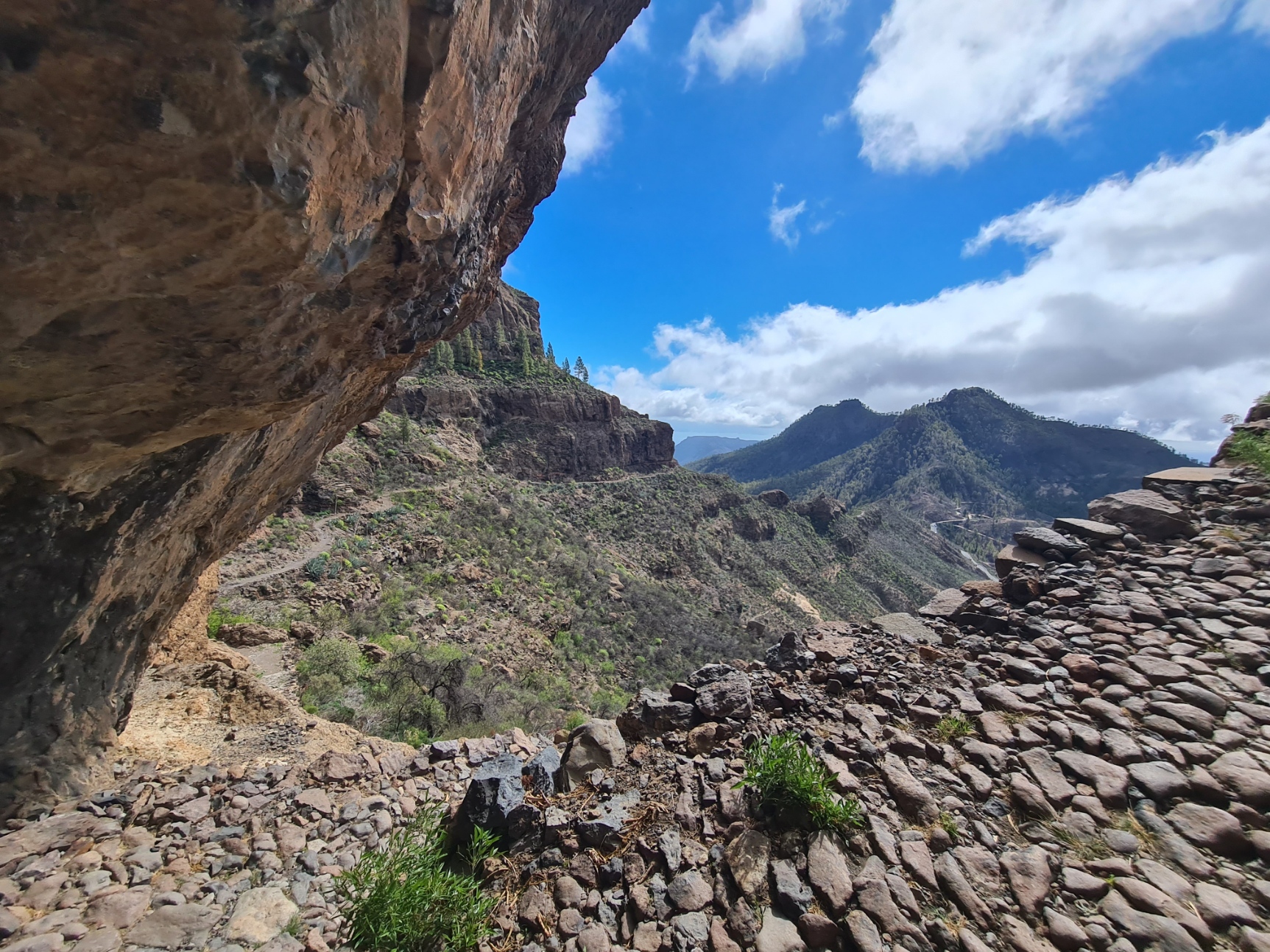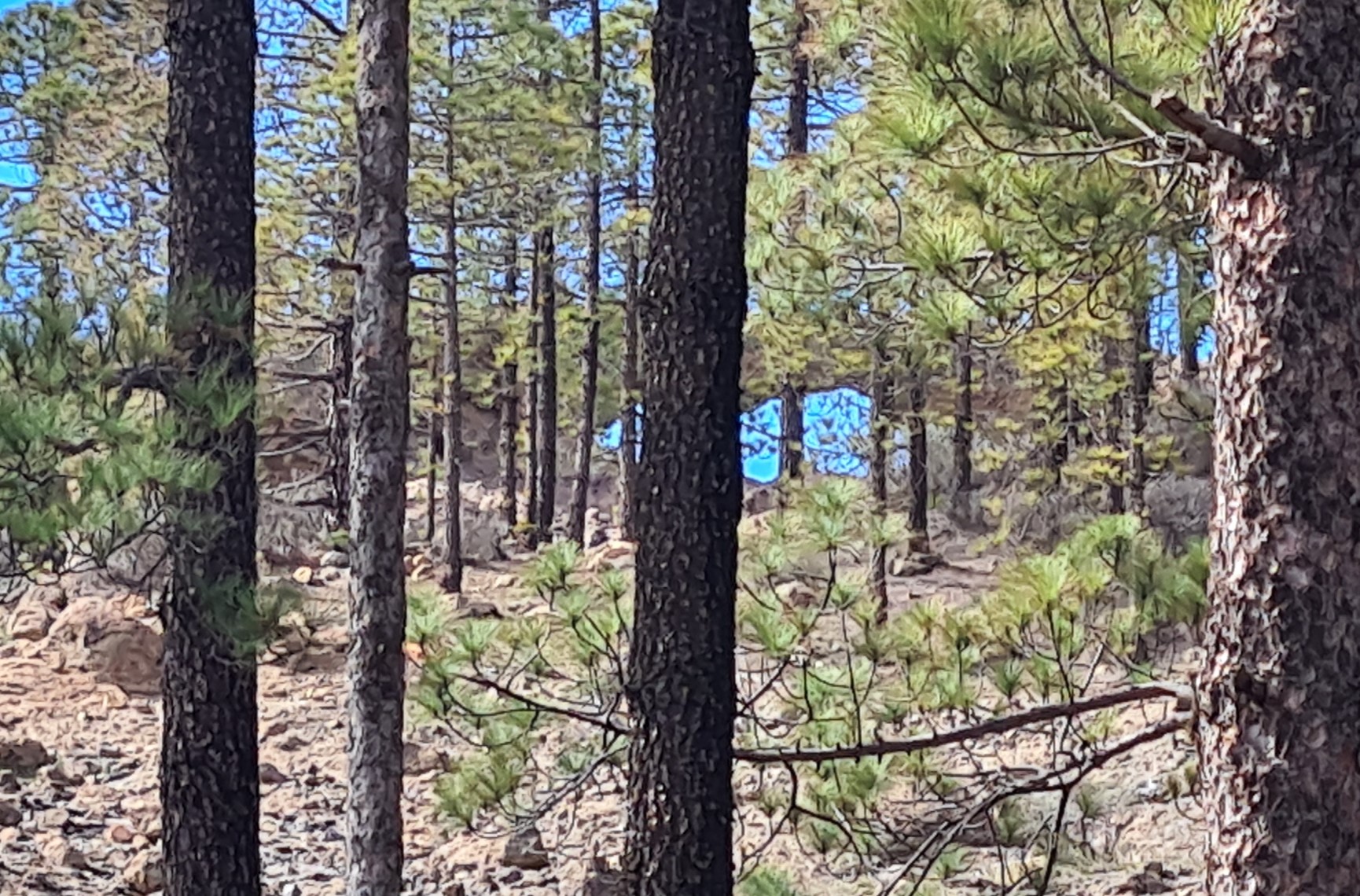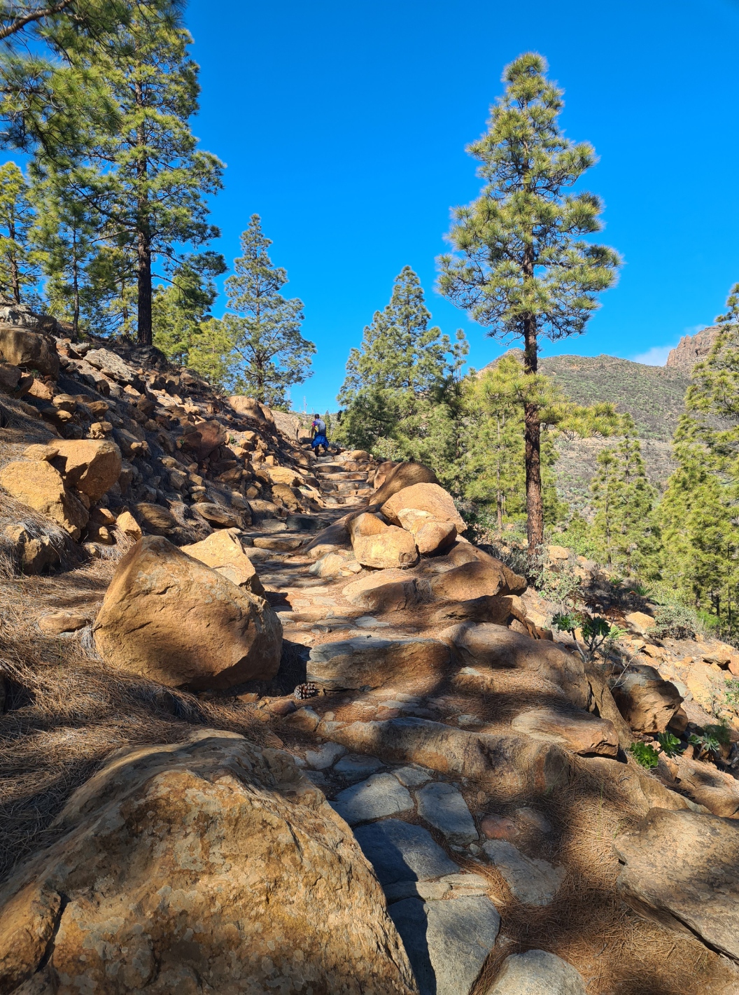 As soon as I had some shade under the pines I stopped for a breather and much needed cool down, hydration and lunch. Also pulling off my shoes to allow protesting feet a little time to air and recover. They weren’t actually that bad today, but I thought a decent halt would mean the remainder of the day might be a tad more bearable. From here, 200m off-trail and uphill is Gañifa, also known as Ventana del Nublo (window of the cloud), a natural sandstone arch that provides a good view of impressive El Roque Nublo, though in truth, it is not difficult to find a decent viewpoint of that prominent landmark from many places.