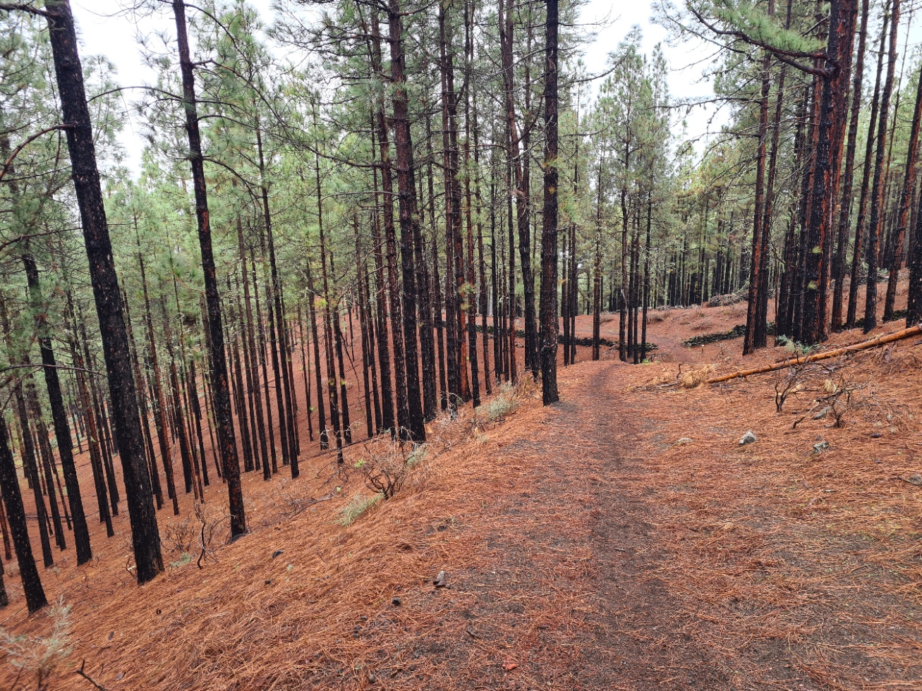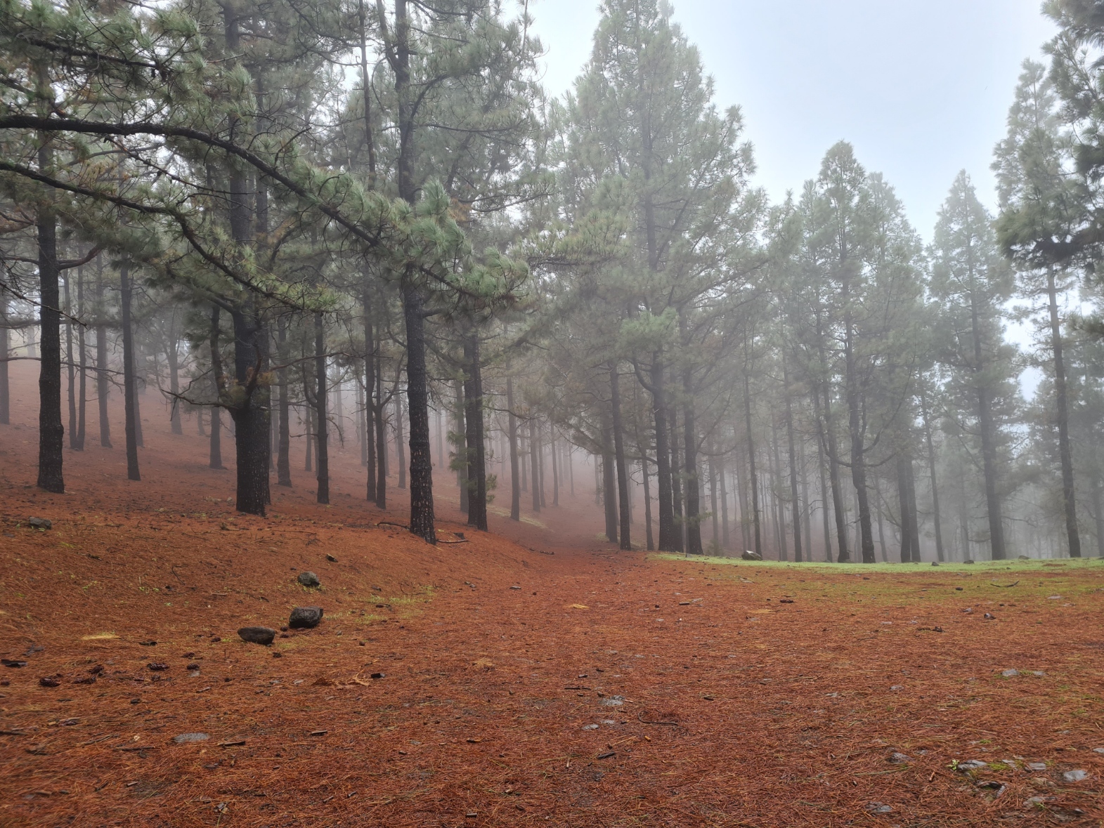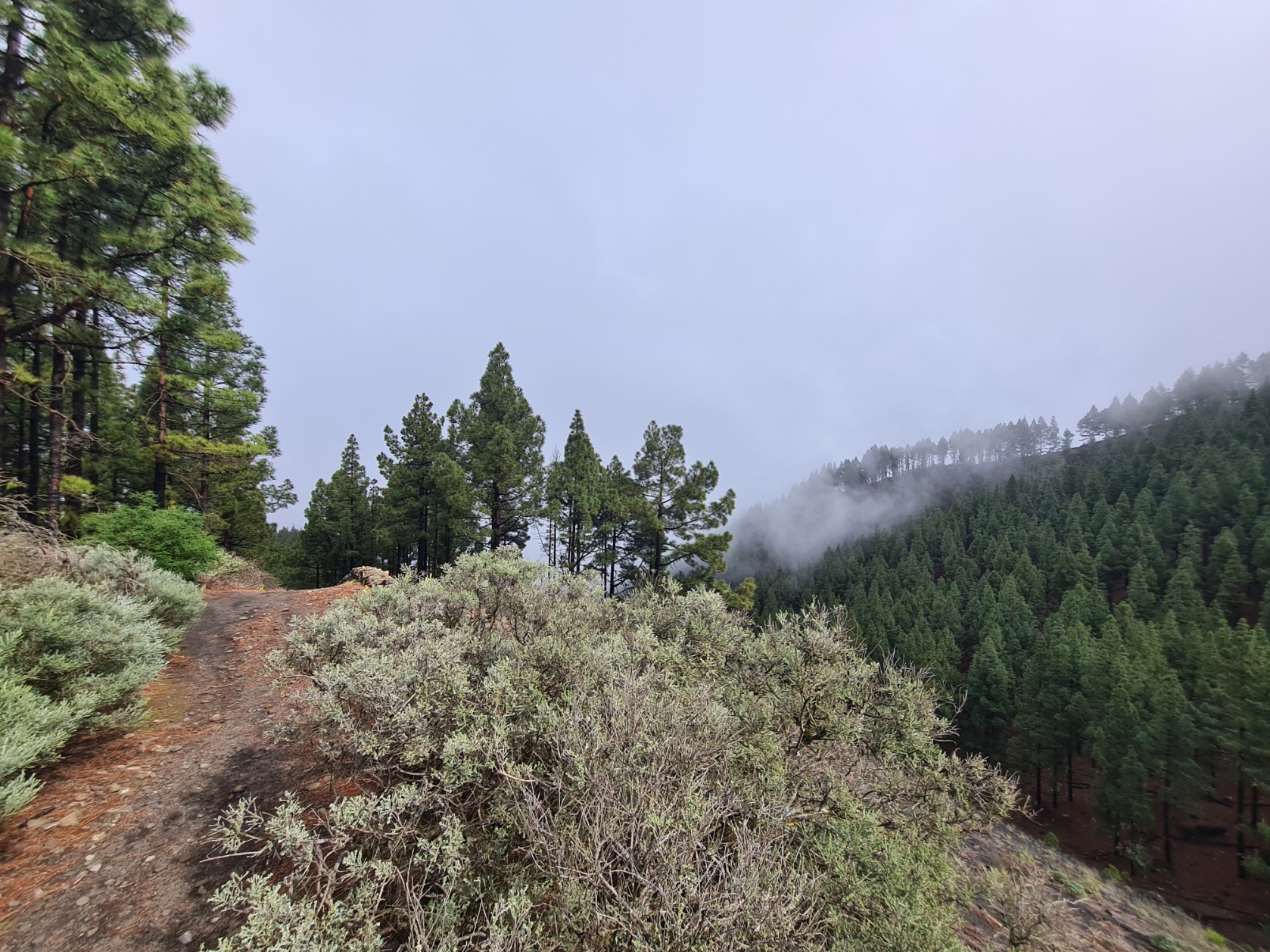 Leaving the muddy contouring paths behind, it wasn’t long before I was again descending, now on really quite lovely pine needle strewn tracks through quiet Canary Pine forests with occasional Chestnuts. It was a fantastic section. I descended steeply to cross a winding road, then back on to another descent through the trees. Having paused to sit on a fallen tree to snaffle a banana, passed by a couple of couples while doing so, I continued along the dripping leafy paths, still mostly denied any sort of view but just occasionally the clouds would drift away a little, briefly revealing tantalising glimpses of hillsides and the suggestion of vistas beyond. Somewhere out there was the Caldera de Pinos de Gáldar, the youngest of volcanos around here, but nope, never saw it.