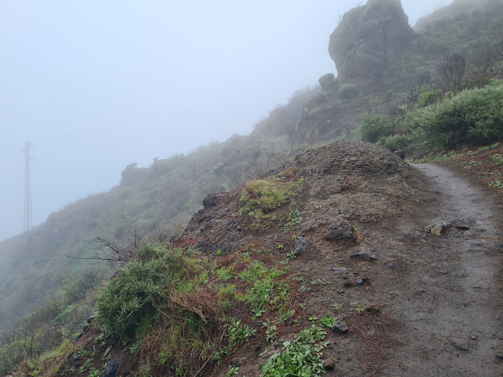 I left the trees at some point, entering what was obviously farmland, as I could smell the livestock through the mist. It was around this point that another hiker caught up with me. Manuel was a German, taking a month out to explore the paths and climbs on both Gran Canaria and Tenerife. He had hoped to complete the GR131 on both the islands but had heard that the other island had temporarily closed parts of the long distance path, so he was more or less making up where he walked. His pack was large and looked heavy but he bound along with an easy and athletic step of the type I could only distantly recall. After chatting for some time he walked on, into the mist and was lost from view, but I would catch up with him twice over the next couple of hours. Not because I was in any way speedy, more that he stopped for frequent rests while I tend to plod along with less halts.