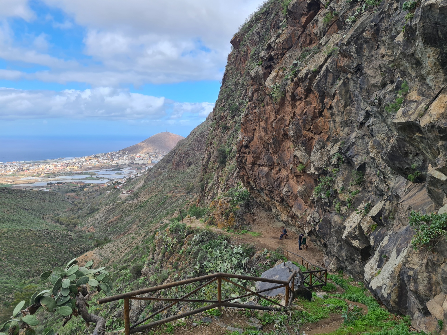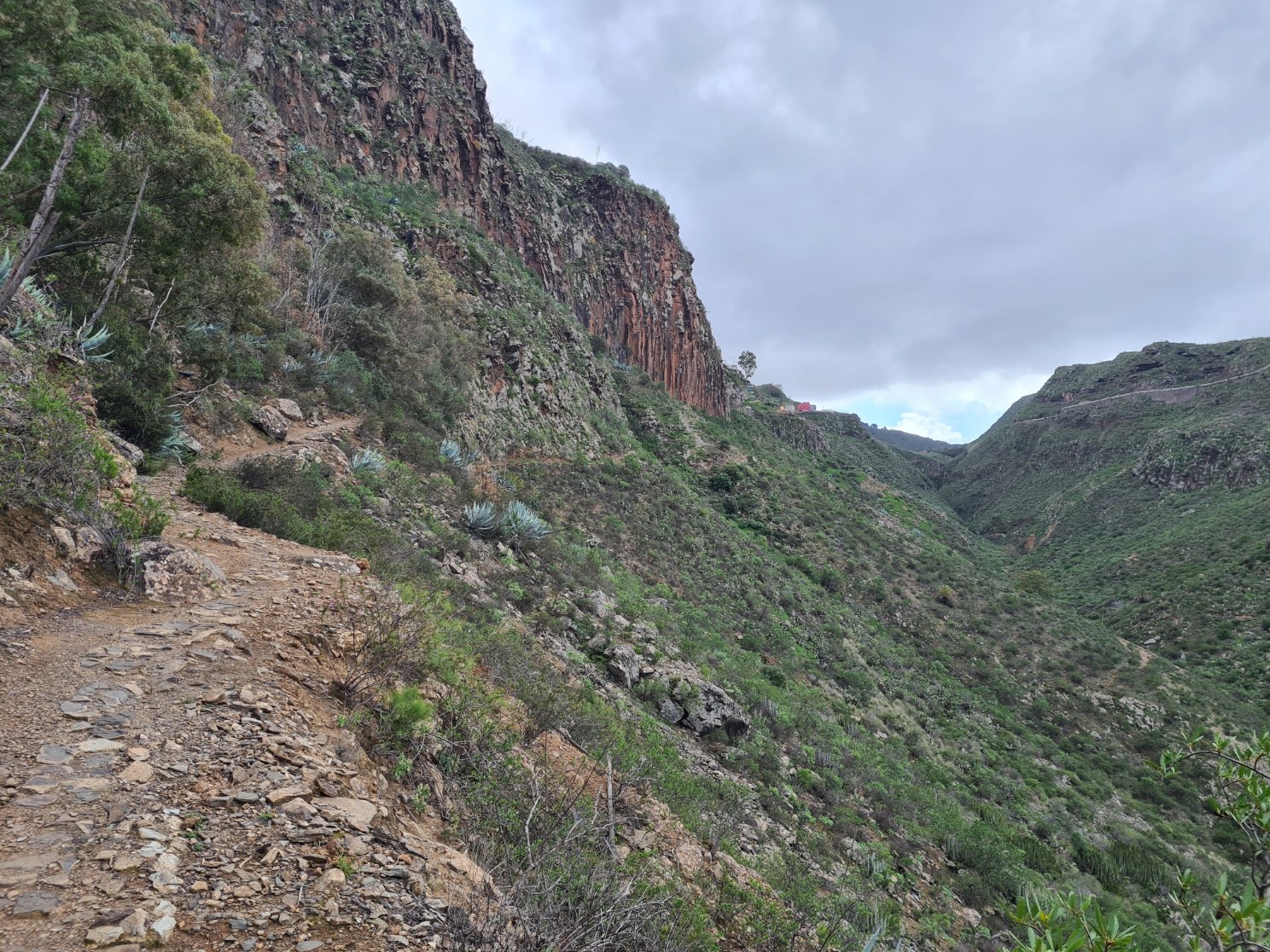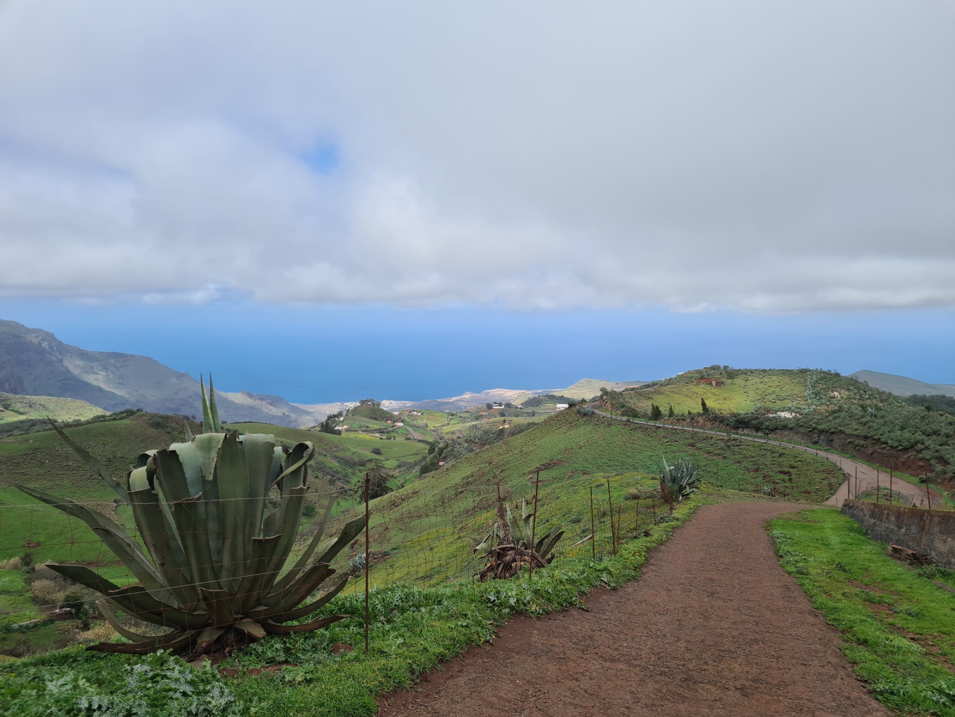 The little farm roads followed toward the coast were very quiet, I think there was only the one car that passed me. Sheep and goats baa’ed and rattled their bells in the neighbouring fields. Brassicas and other greens grew in the fields. I now began to see flowers on this verdant side of the island, in stark dichotomy to the arid southern slopes on day one. Eventually, a fingerpost pointed the way, the pilgrim instructed to leave the road and begin a final descent and approach to the coast. I was now heading toward the stunning ravine-side path that would take me to the outskirts of Gáldar and eventual finish.