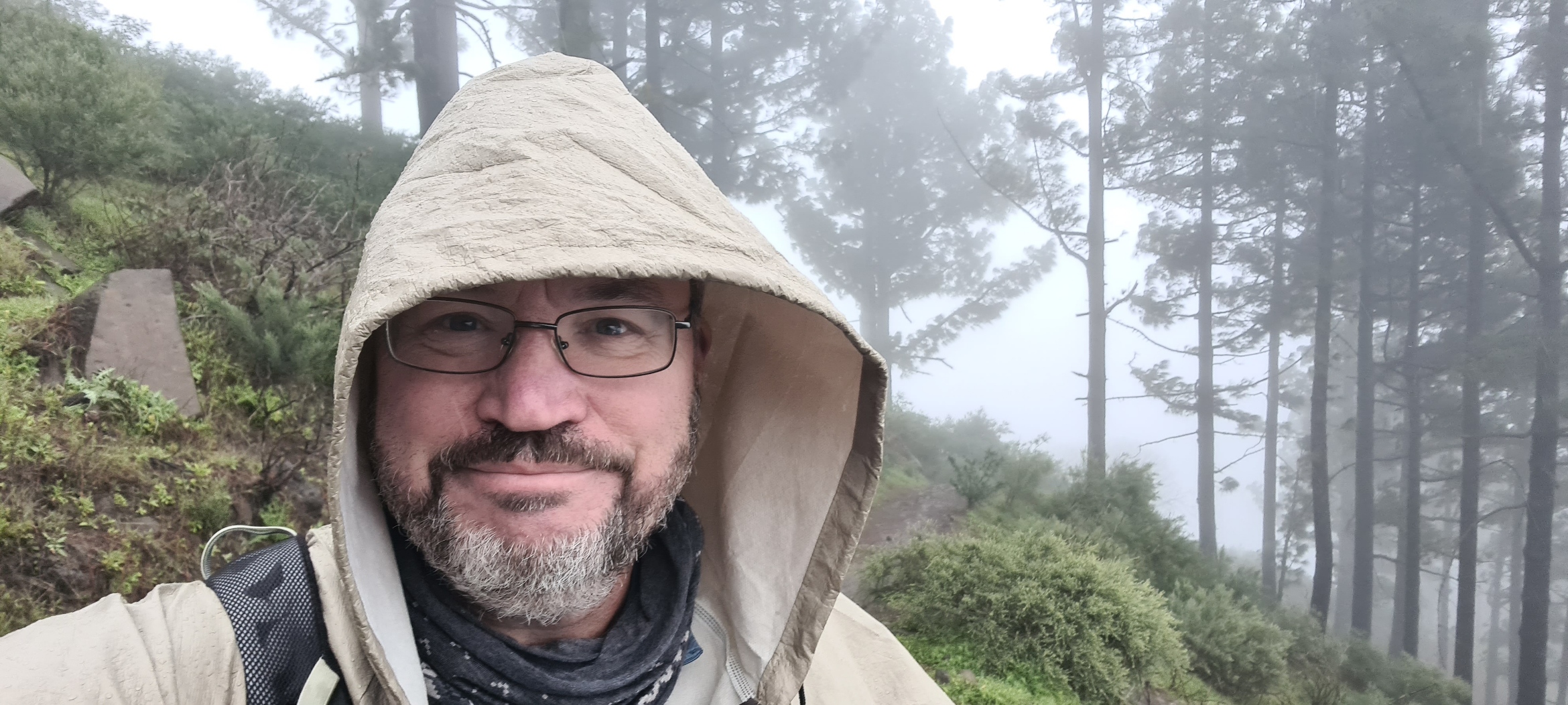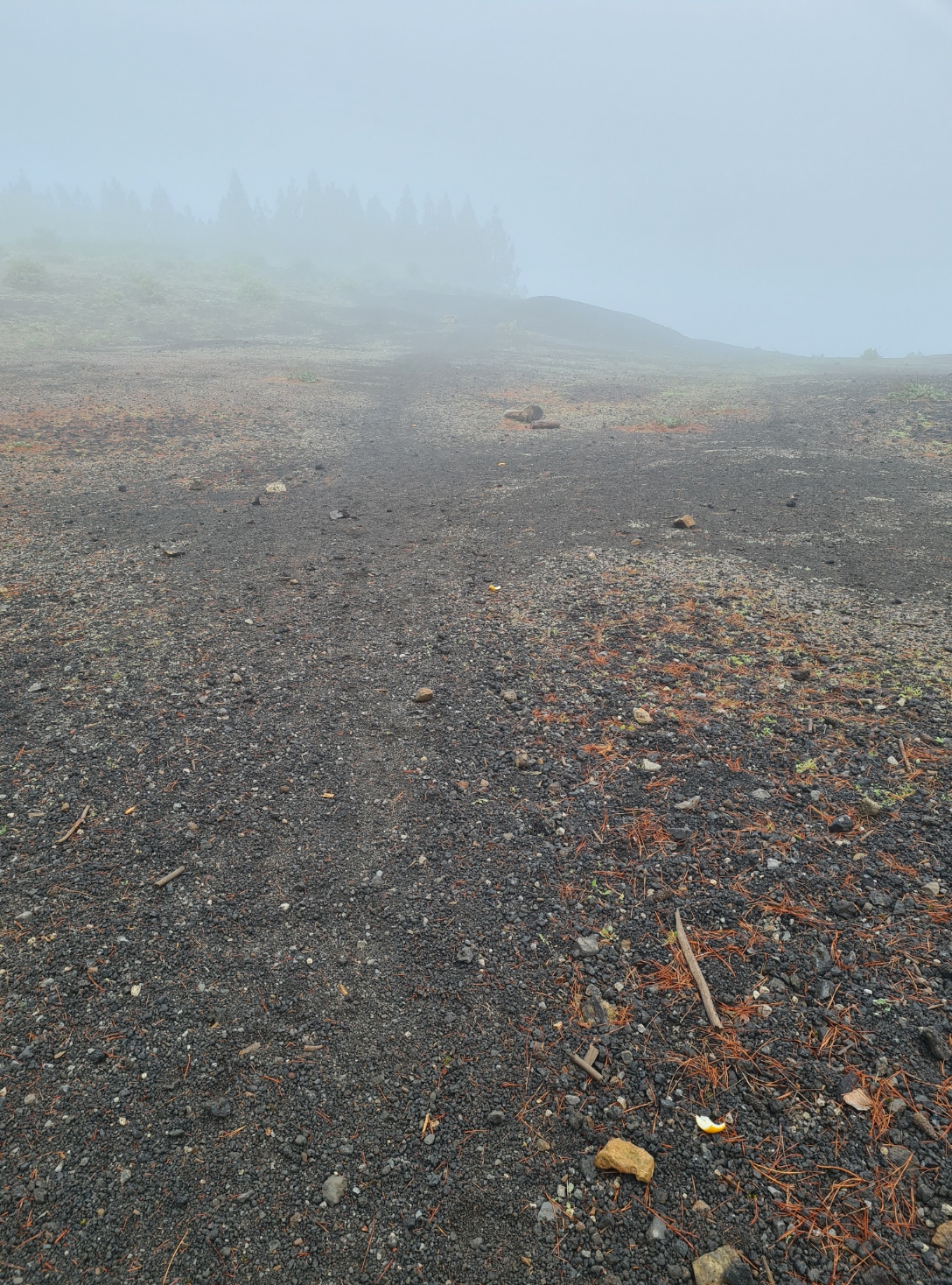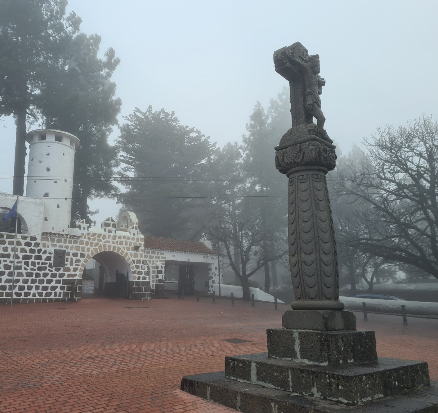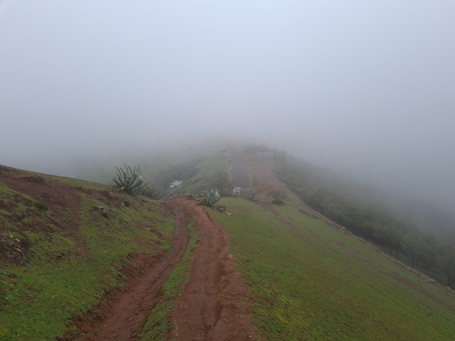 The temperature steadily fell as I climbed and lack of visibility due to the the dark was replaced by lack of visibility due to the clouds I was climbing up into. The tradewinds were blowing through the saddle, bringing both moisture and cold, numbing my fingers. I pulled my buff up from my neck to cover my head. Without my lightweight FroggToggs jacket I would have been soaked. As it was, my spirits were high. My feet felt fine, I wasn’t wheezing so much so my virus had presumably cleared a bit, and I was enjoying my morning immensely. Not everyone was. I stopped to chat to a local runner just setting off to run down to the town I had left a couple of hours before. He muttered his intense resentment at the conditions before leaving me. I could see buildings through the mist above and it was just a short walk up to suddenly emerge near the greenish-grey stone cross from which this spot takes its name. A woodpecker tapped her approval at my having reached the top. As usual, I spent far too long attempting to obtain anything better than my usual poor photographs.