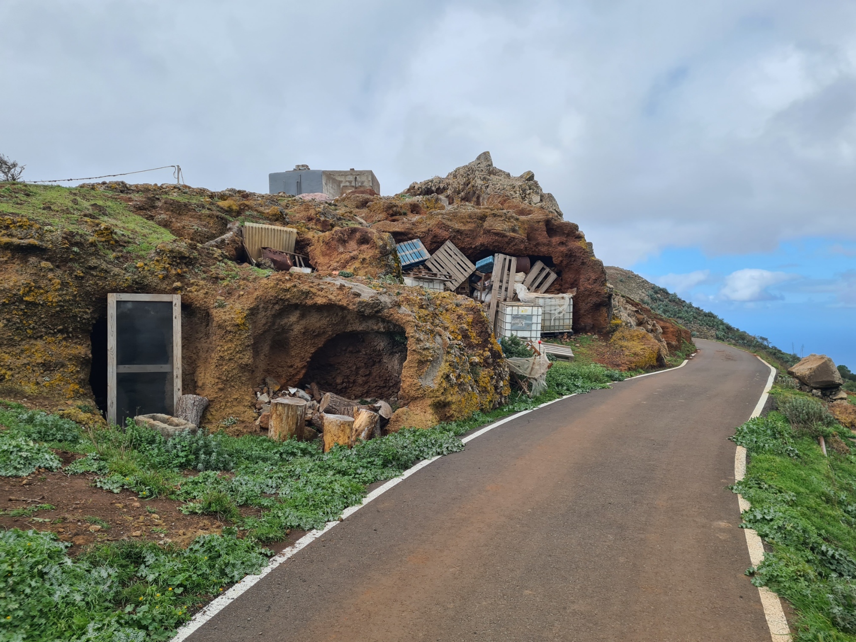 I was now very definitely below the forests and into farming land. It was quite hard to believe the contrast from just a couple of days before. If it were not for the many stands of Aloe Vera, it would be easy to mistake the landscape for many an area in the UK, perhaps the Peak District or parts of Wales. As usual, on entering farmland and being close to rural habitation, there were dogs. Barking furiously at my approach, barking as I passed and continuing their racket when I was well out of sight. Now below the clouds I could see the coast ahead, still a couple of hours walk away. I passed through Lomos de Alguacilejo and near the village of Hoya Pineda. This area is famous for its cave houses but if what I had seen so far was anything to go by, most people have now opted for the more usual bricks and mortar approach. Manuel had stopped in one roadside rock opening so I also halted for a much needed lunch, sharing my home-made bocadillo with him.