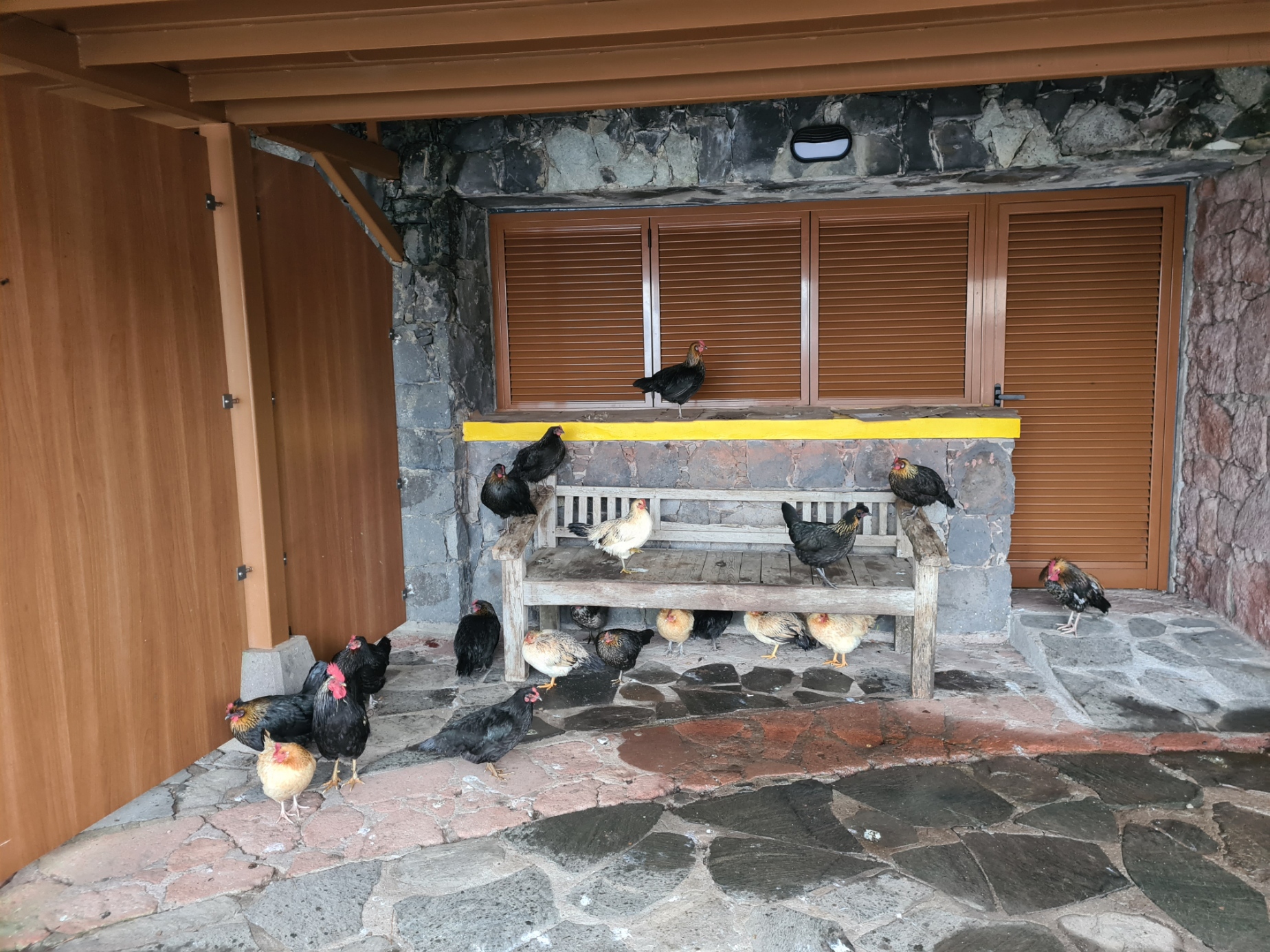 Outside, chickens were sheltering from the rain in the wooden structures that lined the road, that I presume normally host locals selling produce and souvenirs. I joined the chickens. Conditions were so miserable they declined leaving the structure and simply made space for me in the centre of the bench, or walked around my feet, clucking in annoyance. I made a careful check of the map as I didn’t want to set off in the wrong direction from this high point on the island otherwise I would quickly regret it.