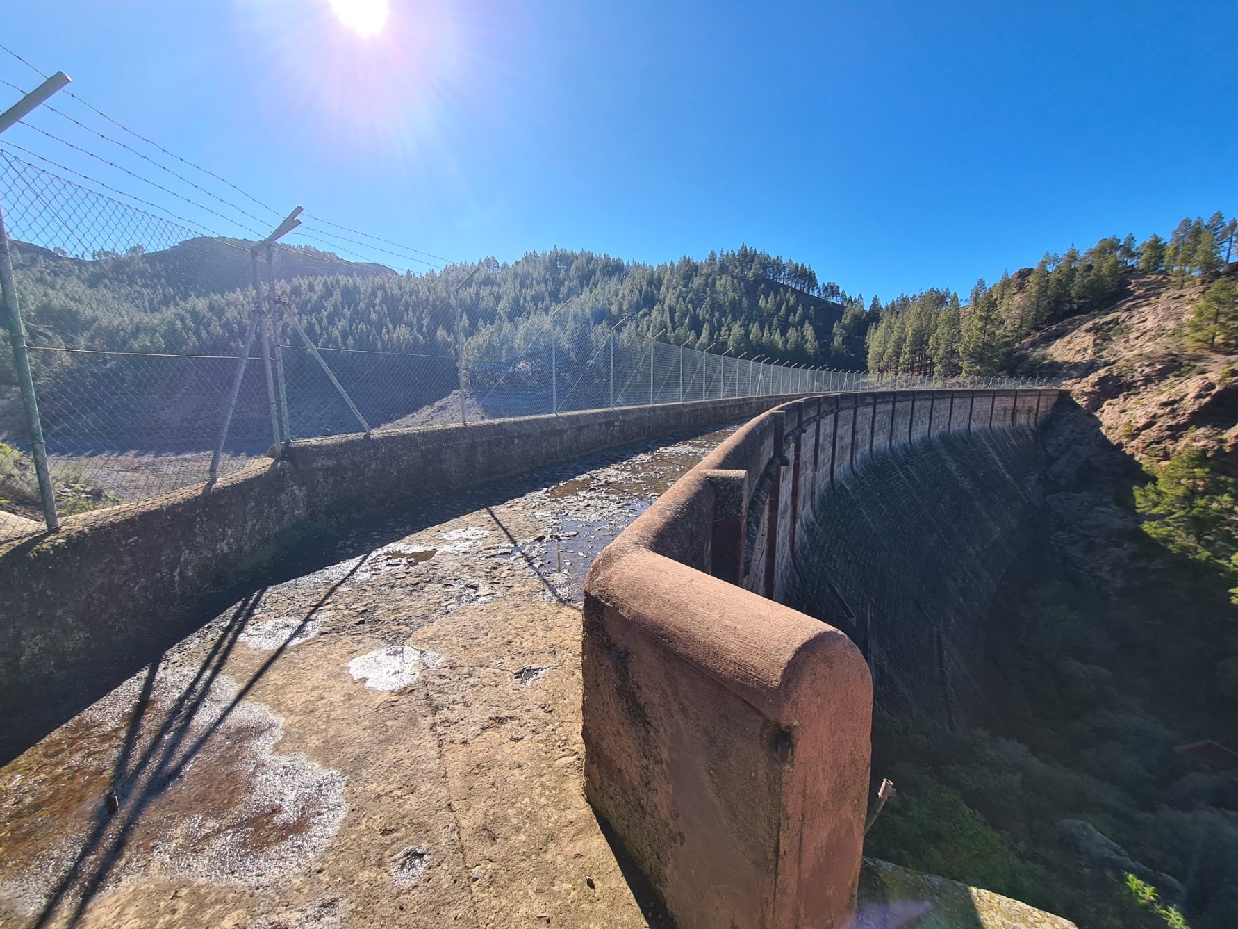 I was able to skip the actual climb up to and around Roque Nublo, saving myself a good bit of a time in the process, by taking the steep mountainside S-70 path about 700m down toward La Culata, dropping down to the volcanic caldera that holds a number of scattered villages and towns, rejoining the variant path later along this route. My path hugged the hillside for a while, then descended to cross Los Hornos Dam. This 27m high dam is built from masonry and was completed in 1933, but was later extended and is now capable of holding 697000m3 of water but had little more than a murky green puddle of water when I crossed it. This type of structure is a fairly typical requirement on a sun-baked island with little standing water. The highest dam on Gran Canaria at 1565m above sea level, any water directed downhill from here goes through tunnels and channels to Arucas and San Mateo. It is often mentioned as a destination in its own right but I wasn’t overly impressed with what I found, if it had been more full, I might have felt differently. On the far side of the dam it was an uphill stretch to join a road on a bend where cars were parked. Presumably the owners off on day walks. But my path immediately left the road and descended a bit before contouring along the side of the hill, a hundred metres or so below the road above. This path would have continued on to Roque Nublo, but lacking the time for all of the variant, I left it at the next junction of paths and began the steep descent into the valley far below.