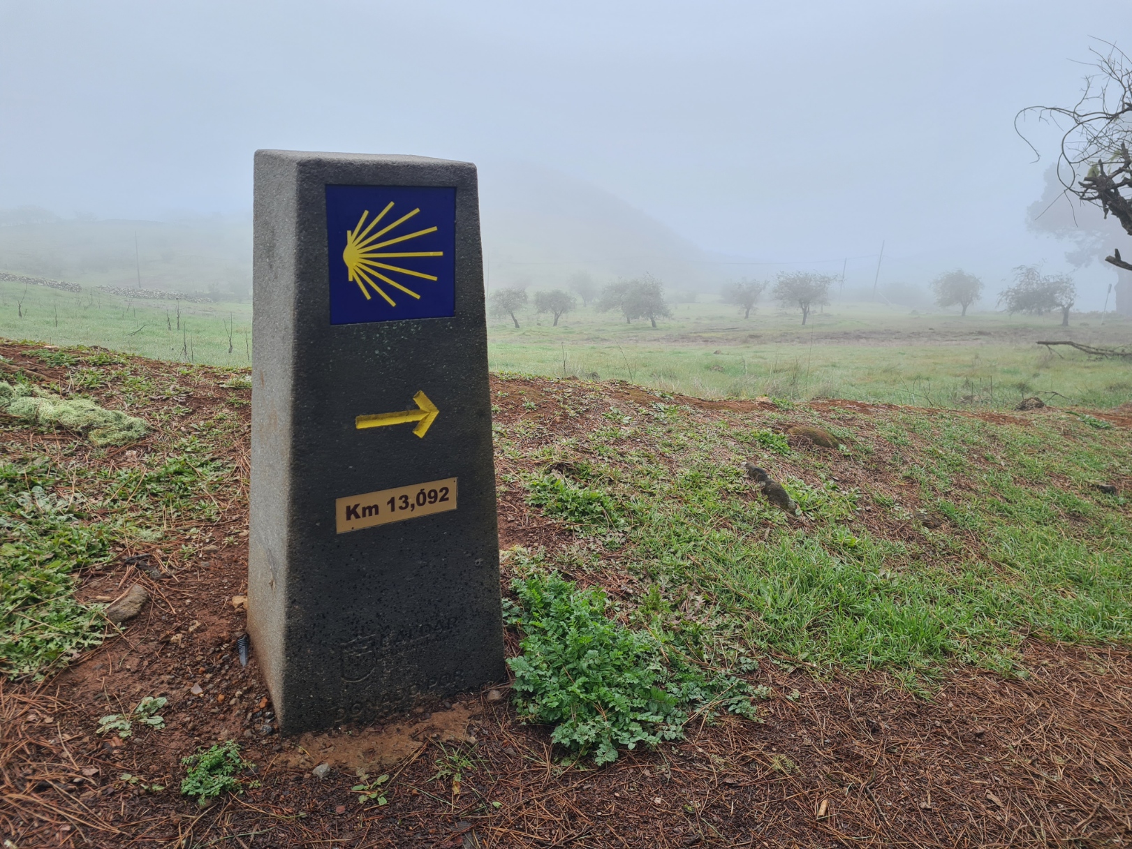 The path followed a short road up to a large carpark then branched off from it’s corner where I stopped to read a tourists’ notice board, then hearing voices behind me. It was two young German girls also walking the Camino. Teseo had met them three days ago. They were in even less of a rush than me, taking a week to walk the trail. Each had a short poncho for protection from the rain, each poncho lofting in the wind and doing a poor job of stopping them getting wet. They were full of energy, happy and chatty, urging me to walk with them. I declined, preferring my own slower and more careful pace around the slippery wet and muddy path that contoured around the hill from there, with a steep drop off to the left, disappearing to who knows where. My path then climbed, further into the mist, any sort of view denied. I heard the two girls chatting somewhere ahead, their voices faded, and I never saw them again.