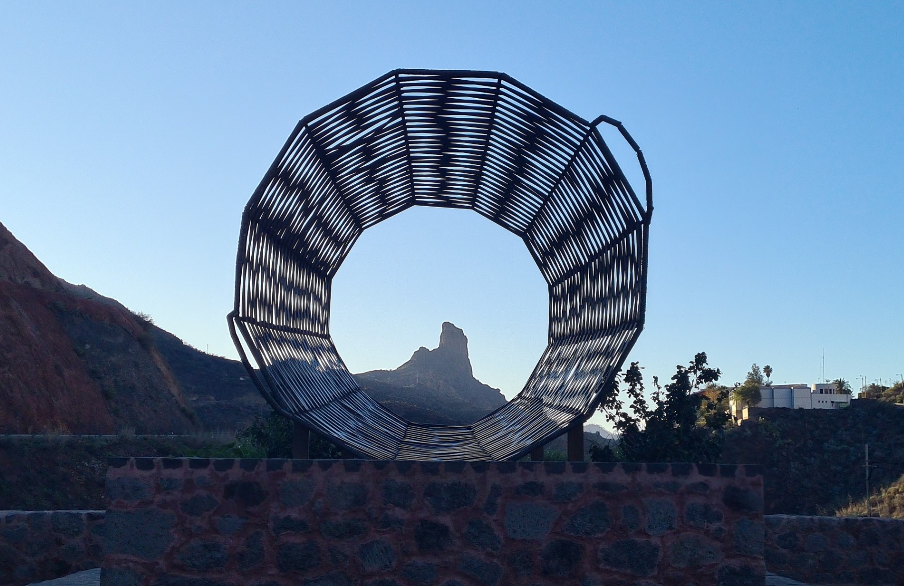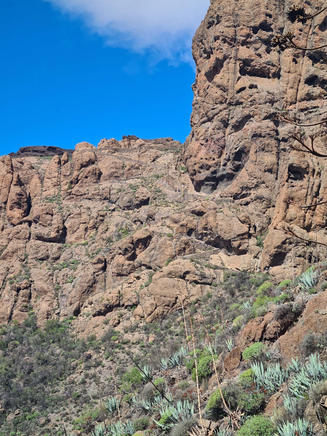 My downhill went on, and on. Having arrived at La Calata there was a bit of a road walk through the town (on the GC-608), before an almost hidden and seemingly forgotten path took me away and down from the road into Barranco de Tejeda. The trail led me down and through scrappy allotments and small holdings that ended at the roadside mirador at Casa de la Huerta, where La Cesta, an oversized basket sculpture, provided ideal framing for the distant ‘Sacred Mountain of the Aborigines’- Roque Bentayga. I was now back on the variant trail but judging by the condition of the path I had just followed down, I don’t think many walk this way. to eventually emerge on the GC-60 main road that is followed into Tejeda. Now tired, I was nevertheless finishing my day in much better condition than I had yesterday.
