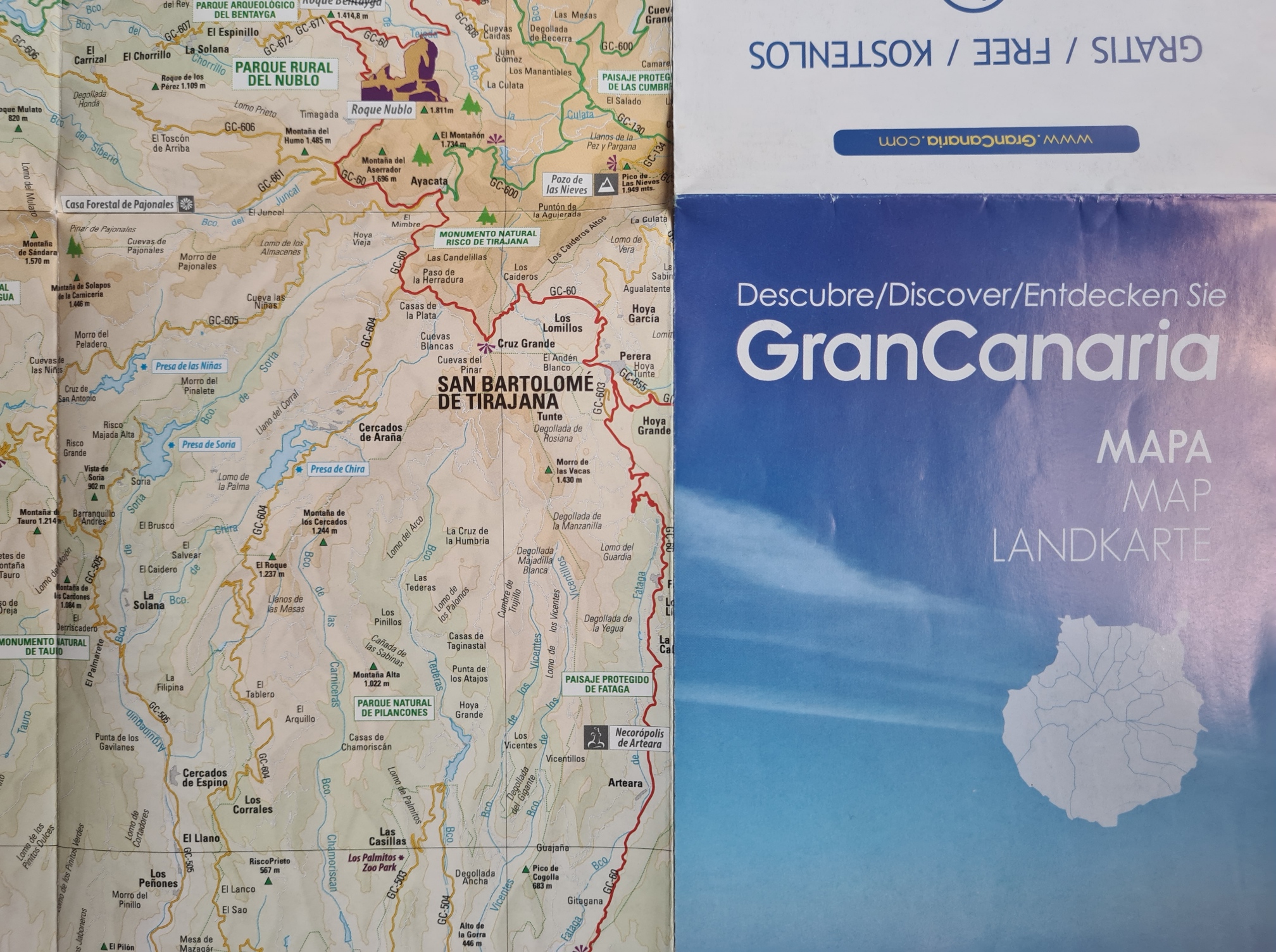 It really isn’t hard to find a hard copy paper map of Gran Canaria when actually on the island. They are found everywhere. However those are for road users. Quality and detail vary a lot, usually dependent on how many adverts are also being squeezed on, as something has to pay for them to be produced. The best of these maps is usually those provided at the myriad of car rental establishments, these show all the major roads and almost all of the minor roads that go into the interior. None of these are in any way suitable for hiking. The detail simply isn’t there. Use them with a car, bus or taxi to get to a trailhead, but abandon hope thereon, unless you have a further resource.