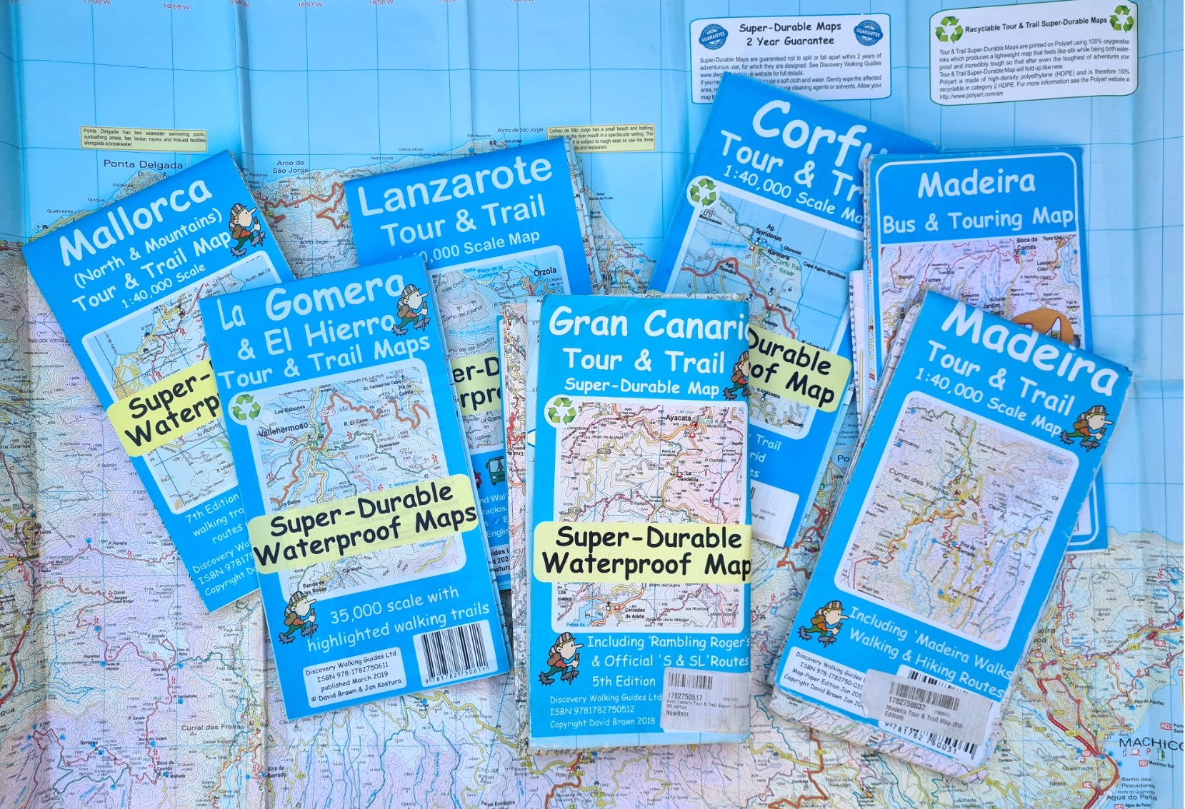 The ‘Tour and Trail’ map from Discovery Walking Guides is at 1:50 000 scale and in addition to showing a great many of the trails, is topographic, namely, it includes contours, just about essential when planning a walk, and extremely useful on trail too. These are at 20 metre and 100 metre contours, and are combined with altitude shading that give a feel of the landscape being walked across. Rambling Roger maintains a page showing where the maps can be purchased on the island.