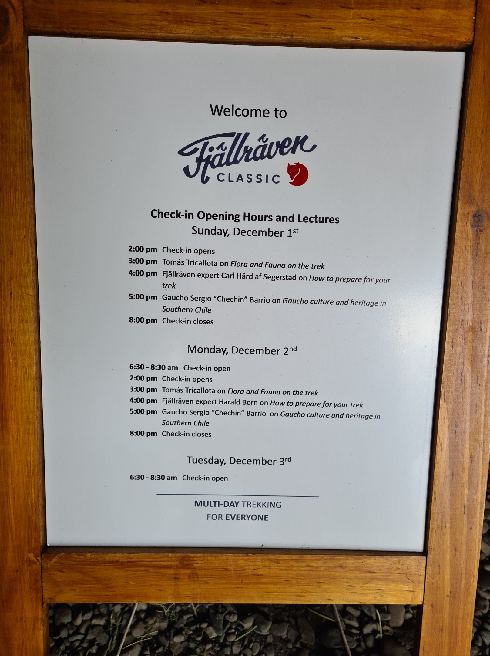 Classic Chile has two start days in order to spread out participants on trail. There had already been around 250 starters this morning. I was booked to start tomorrow, on Tuesday 3 December. There would be around 150 participants setting off on the second day. There are a couple of start times each day, again, to spread out the hikers. I had booked the 10.00-10.15 slot, along with a seat on the shuttle bus to the start, a thirty minute ride out of Puerto Natales. But today, I was simply joining the excited melee in El Galpón (a large waterfront shed) to complete the necessary admin and collect what was provided. As with all the various Classics, there was a bright orange identifying square of material to tie to the outside of my pack, a trash-bag, roll of TP, route map, dehydrated meals for the first two days and a gas canister for my stove. The other meals would be provided half-way through the trek. Perhaps most important amongst these was a passport in which to collect the compulsory check-point stamps. Collecting these is a requirement to receive the finisher’s patch, medal and pin badge at the end. I also blagged a free branded T-shirt.