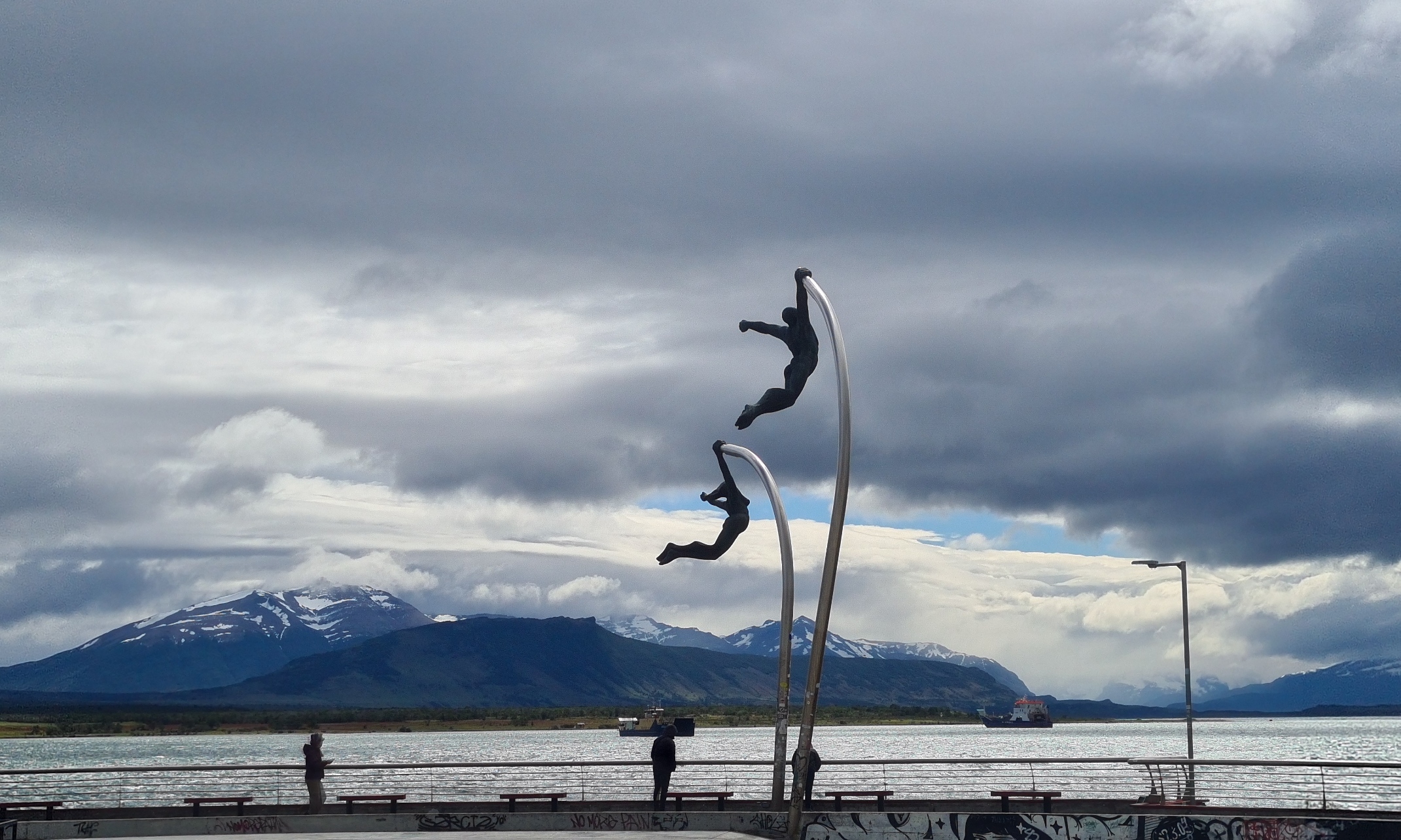 Having completed check in, listened to the talk and chatted to a couple of people, I left a huddle of hikers, many attempting to stuff food in to their already bulging packs. I first walked down to the seafront, to see the prominent art work: “Amores de Viento en Natales“, showing two people, high above my head, that seem to stretch out and fly in the Patagonian winds. Winds that I was already slightly apprehensive of as they have a reputation of attaining incredible force. I walked beneath the two figures, out on the wooden boardwalk to look across the water. Somewhere over that expanse, amongst those snow topped peaks opposite, was Argentina. I felt a long way from home and was quietly excited.