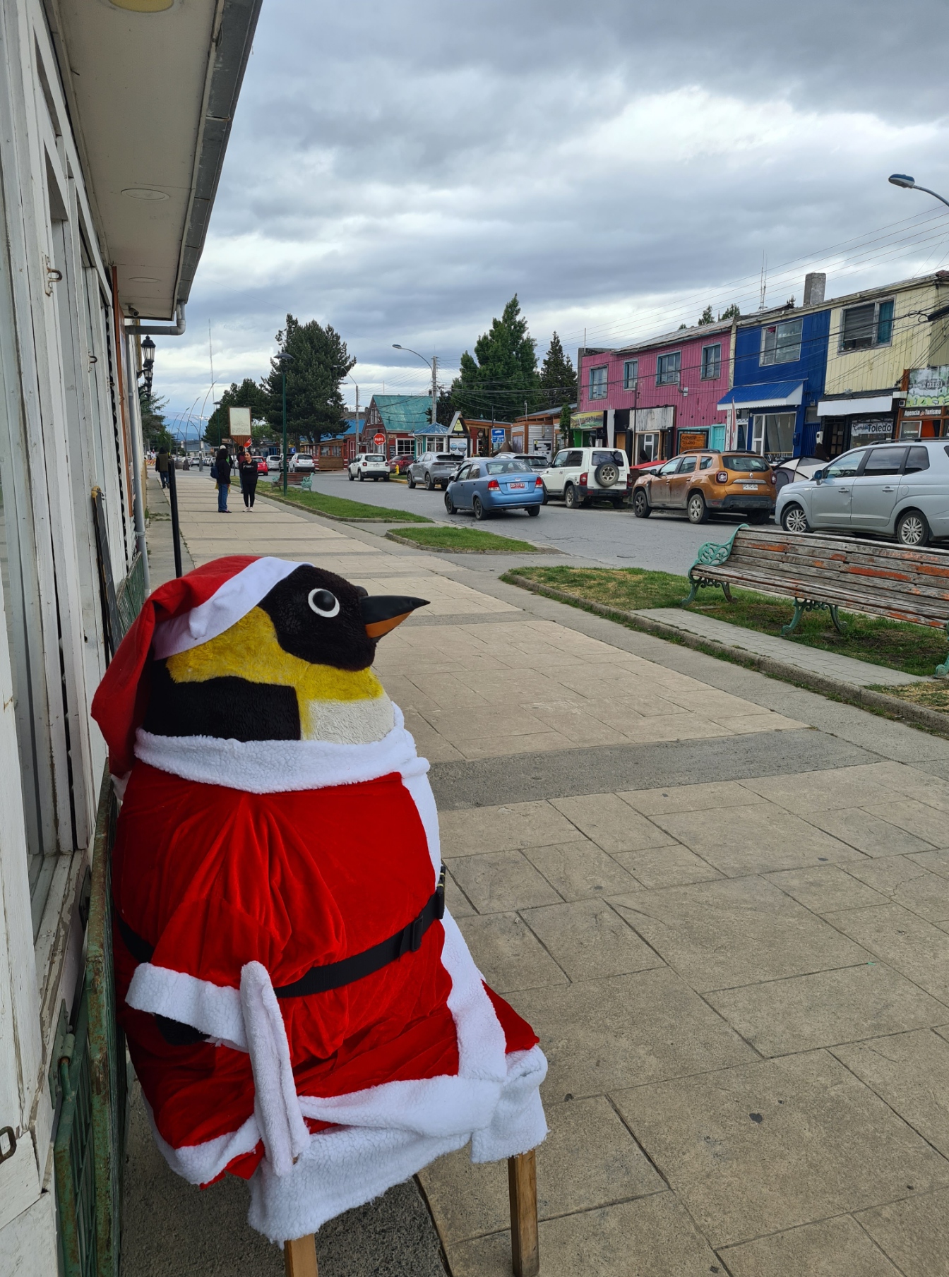 So, I now found myself walking down through Puerto Natales to the coastal road, looking for the Fjällräven Classic check-in. Shops and houses were beginning to put out Christmas decorations- bunting and decorated trees, coloured-lights, outside one shop was a large inflated penguin decked out in Father Christmas costume. Though I must admit I was most impressed by the variety of rubbish bins, made to look like various characters.