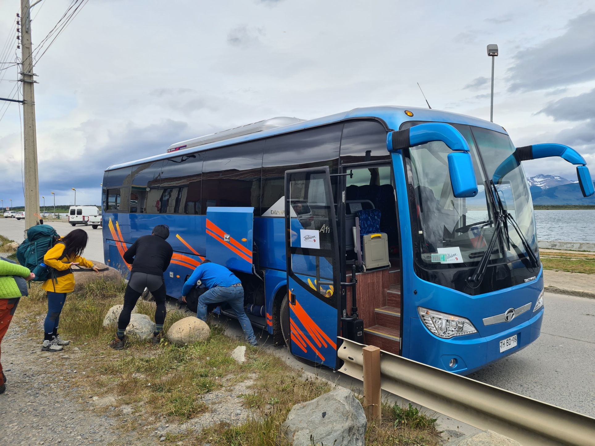 Despite being a B&B Hostel, I never did discover the second B, and breakfast-less, left the accommodation at eight in the morning, for the ten minute walk back through town, down to the coastal road to the large shed-like El Galpón, where I had checked in yesterday. I was a little surprised to find only staff and volunteers inside and I was the first hiker arriving for the later start group. The previous starters had left some time earlier, but other hikers in my start group began to arrive within a few minutes. There was soon a quiet buzz of excitement amongst the dozen or so that gathered. I had a coffee and croissant from the little pop-up café and also purchased a ham and cheese toastie, asking them to wrap it up. This would be tomorrows breakfast. Then I joined a short queue to leave my unrequired luggage at the bag drop. I was surprised at the large suitcases many were leaving here and for some reason felt somewhat self-conscious when I handed over my limp cargo bag with its meagre contents, that had encapsulated my pack on the flights out, in which I now left a set of ‘town clothes’ and map and guide book for a hike I hoped to complete after the Classic. I hadn’t felt the need to bring anything else with me to Chile. After a few minutes, during which I took the opportunity to use the w/c, I went outside to wait for the shuttle bus that would take our small group to the start point at Dos Lagunas. This is around 30 minutes from Puerto Natales.