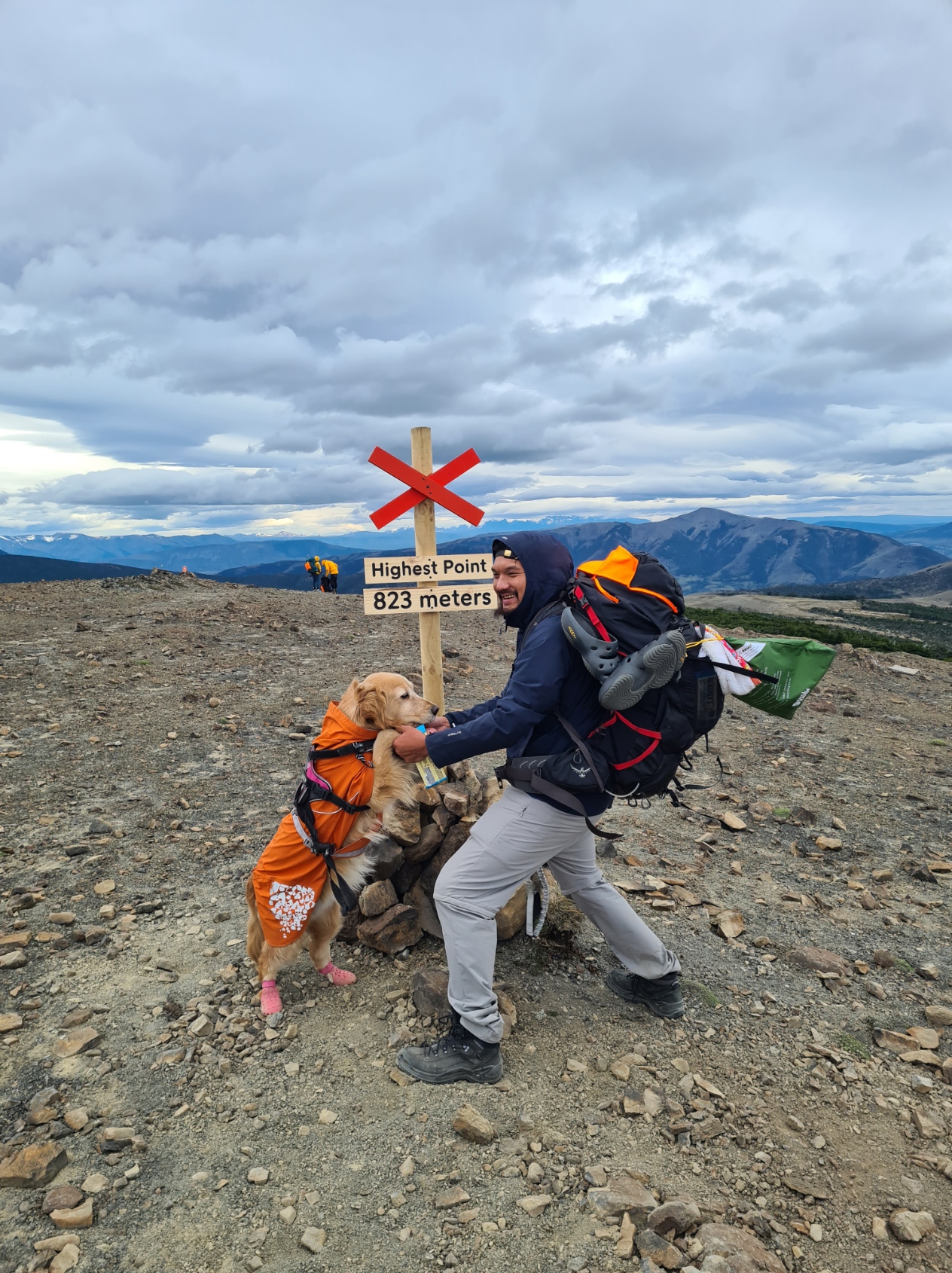 I keep a journal on most of my multi-day walks. This will eventually be my memory jolt and recourse when I am old, knackered and doolally tap, incapable of completing longer hikes. I asked each checkpoint to also stamp my journal in addition to the necessary application to the official trekking passport. After which, I was given a tasty blueberry bar. Most of the checkpoints have a treat of some sort. Dropping my pack, I took this and my bottle of water to the nearby mirador. Both consumed while enjoying the wide view from the clearing. Harrold had left me a couple of km back, to walk in with hikers that I had passed, but now came in, and he joined me at the viewpoint for a chat. He is a product-development manager for Fjällräven and was carrying a prototype, large capacity backpack. Of particularly lightweight construction, it was a bit of a diversion for Fjällräven, who normally produce heavier and more robust gear..