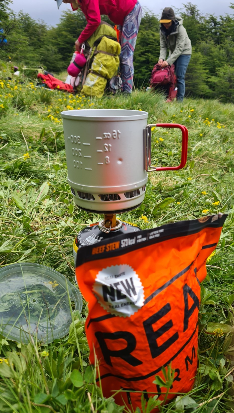 It was then down the sparsely vegetated surface, a gentle, stone clattering, descent and back into the trees below. Then dropping further down to the left, down to grassy slopes, where I came across a large group of hikers sitting in a sheltered clearing, close to a small river. Obviously in common with them, this was what I had been hoping for as a suitable spot for lunch. Despite normally preferring a little more solitude for my lunch halts, I didn’t have to think much on the subject as I was now hungry and it was a lovely place to stop. Drop pack, and prep a decent Real Turmat dehydrated beef stew and brew for lunch. Sitting there, I picked off the various beetles that tried to attach themself to my pack. Not sure they would appreciate being carried miles from their home. Before setting off I slipped and slid down to the stream to filter and top up the water I was carrying.