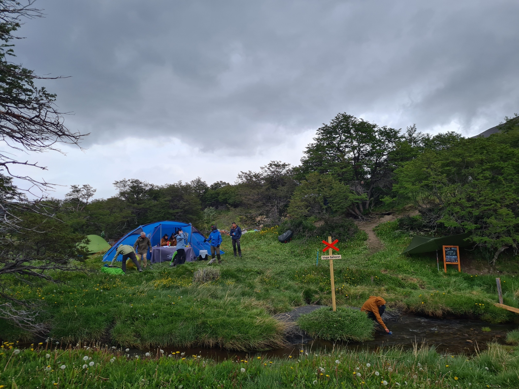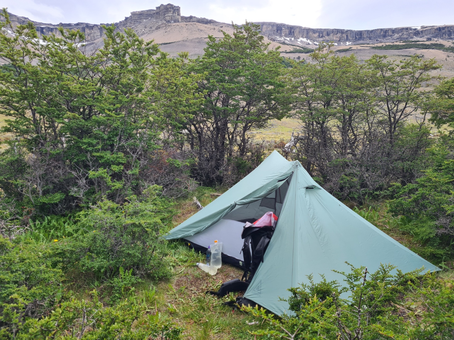 Southern Patagonia is known for its unpredictable mountain weather and strong winds but I had been fortunate so far. The organisers were obviously well aware of how windy a site tonight’s halt could potentially be as they were keen to stress the need to look for as sheltered a spot as possible. All well and good but I had been in a later starting group and a great many hikers had come in before me and obviously all the prime spots were taken. Some 150 hikers were going to squeeze into this night’s stop, 250 had somehow managed it the previous night. I walked the extent of the small stretch of trees, as far as the bordering barbed wire at the far end, beyond which we were not supposed to stray. Just before this barrier, with a bit of clearance of a few fallen branches I produced a decent patch of ground, surrounded by sheltering trees, sufficiently large to take the large footprint of the Durston. No need to put it up in ‘skinny mode’ tonight. I saw later that the many hikers that came into camp after me spread themselves out across the more exposed ground each side of the river below me. After pitching, I went down to the river to filter three litres of water for tonight, tomorrow morning and the first few hours of hiking. I found the air thick with mozzies and was thankful I hadn’t ended up down there as it was a sub-acceptable pitch. While it did get a bit wet and breezy overnight, the weather was fortunately nothing remarkable and I don’t think anyone had much issue. Well at least I never heard of any problems.