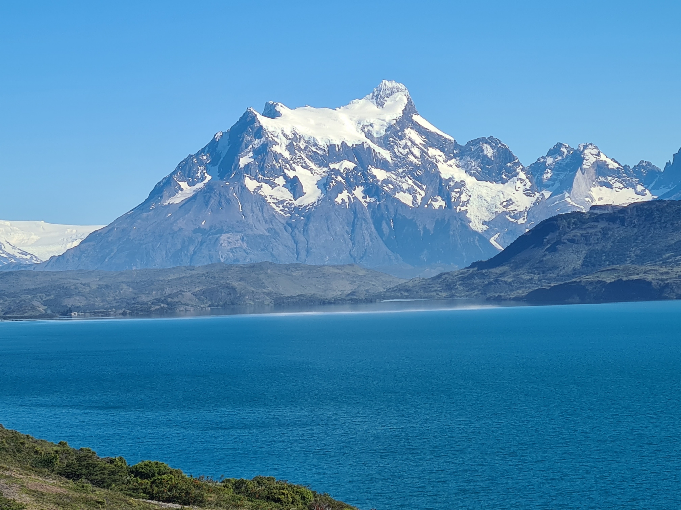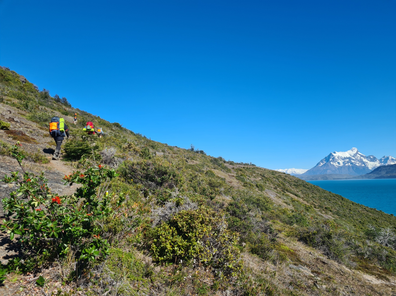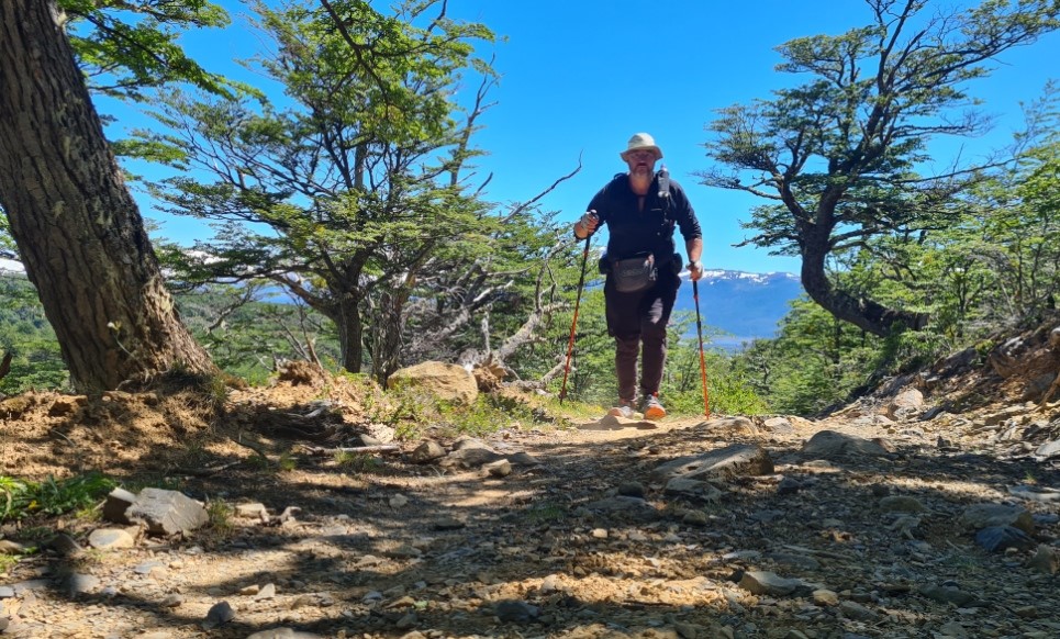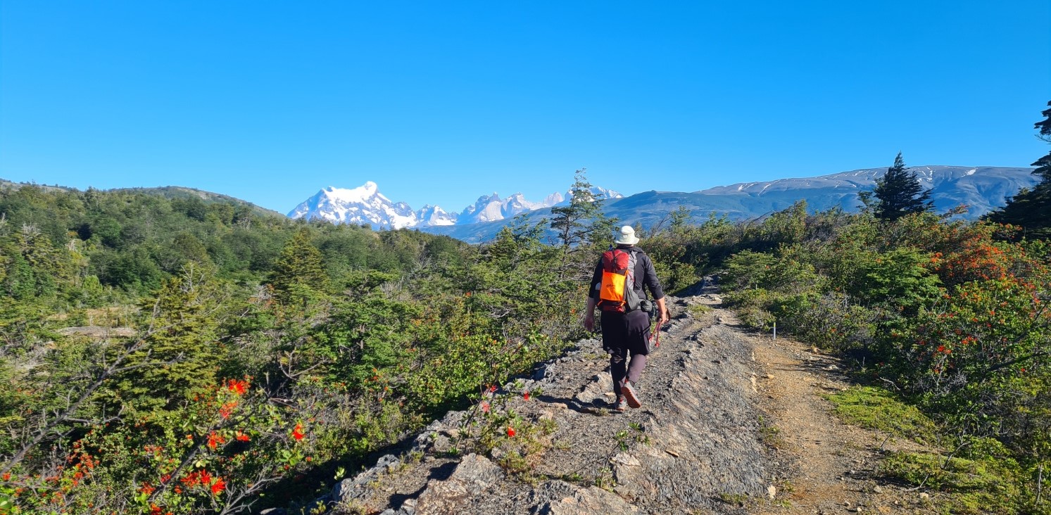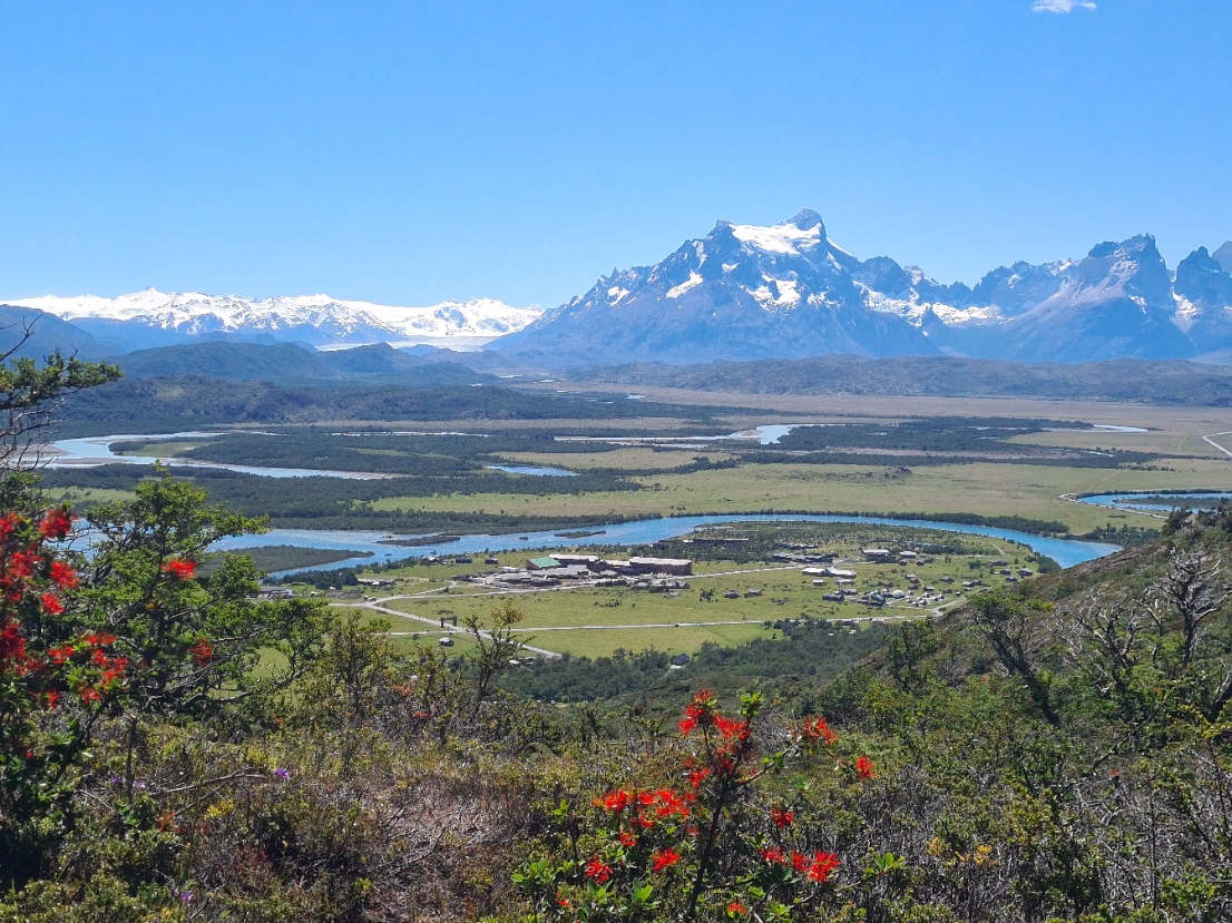 Butterflies were fluttering between the many flowers. The sky was clear of cloud and the sun was strong. I kept my wide brimmed Tilley firmly covering my thinning hair but noticed a few hikers were going for full face covering for increased UV protection. I crossed a road, seldom encountered over the four days, beyond which was more climbing, providing ever better views over the Paine mountains and glaciers.