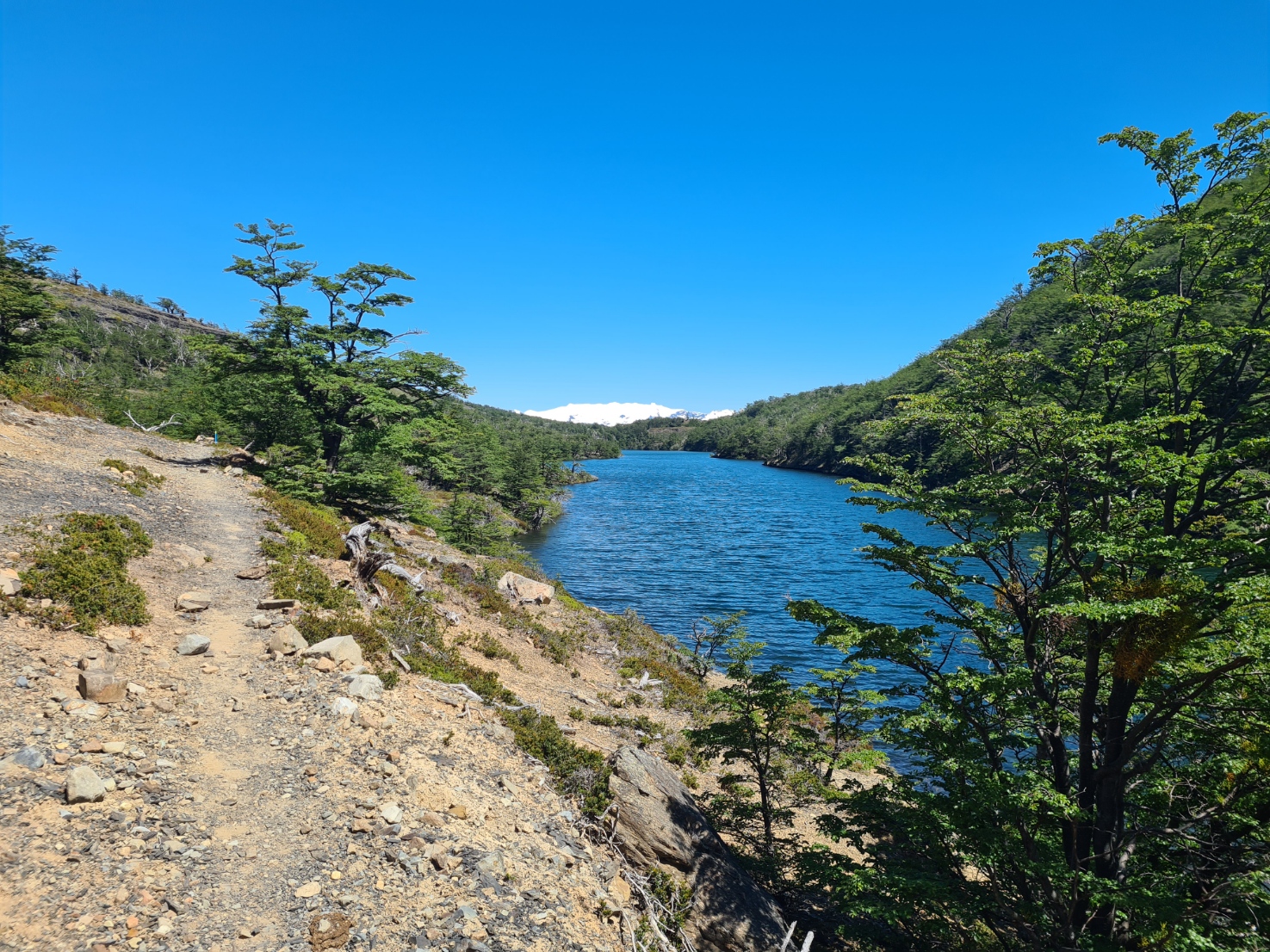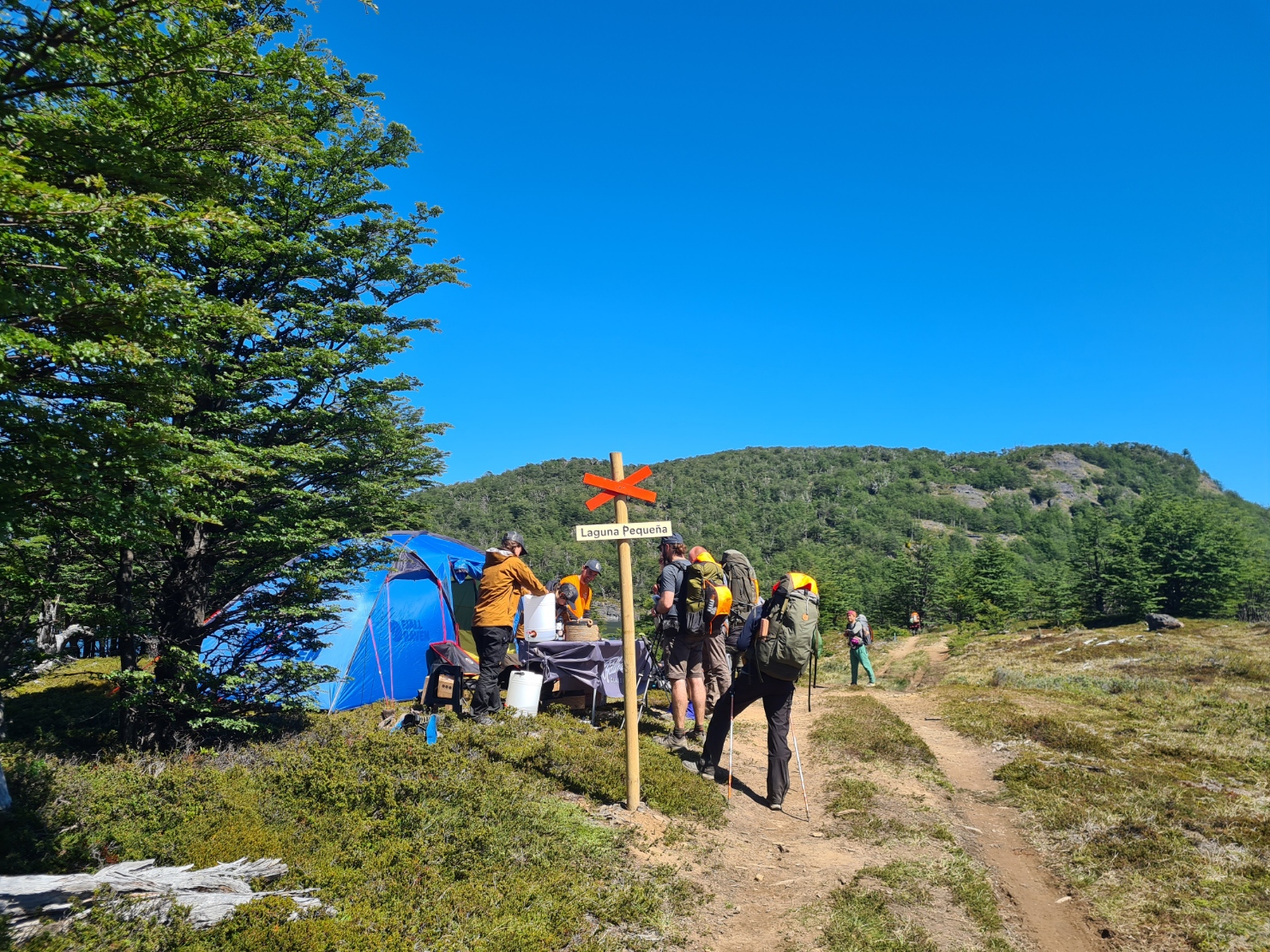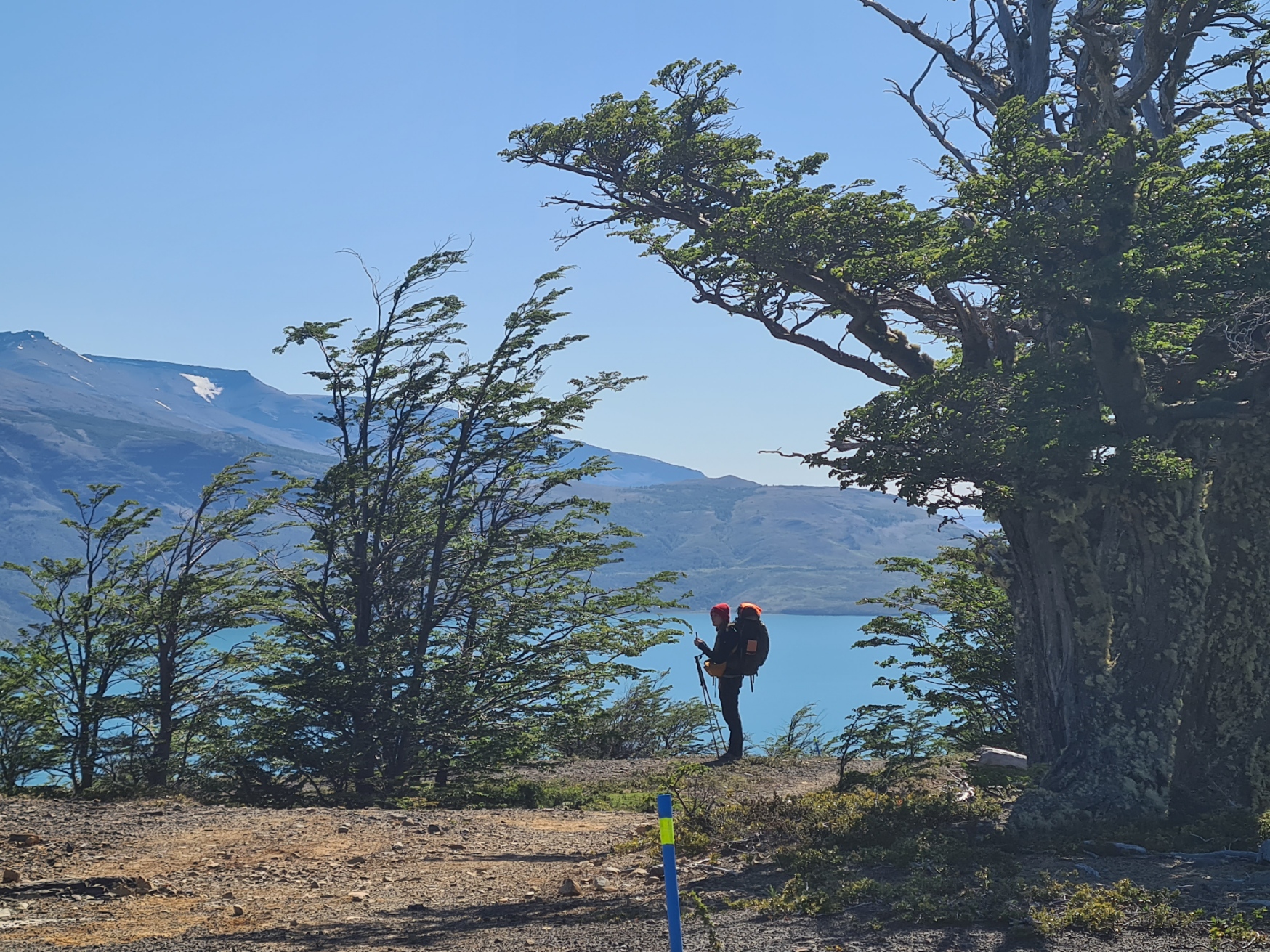 I reached the penultimate checkpoint at Laguna Pequeña 9km from last nights camp. There was a treat on offer here- Alfajor de Calafate, a traditional sweet confection. I didn’t need this immediately so saved it for later, instead drinking some of the weak diluted rhubarb juice provided, which was very welcome. My filter had become ever harder to squeeze, probably due to the suspended silt in the melt waters clogging up the pores. I went down to the lake to collect a pan full of water and boiled and sterilized it for both rehydrating my early lunch and to top up my water bottle. My meal wasn’t amongst the best I have enjoyed on this trail. Clipfish Casserole apparently being Cod, and chewy Cod at that. I ate it with shoes off, airing my feet. The first time I have had to do this, both heels were still sore and I popped a couple of ibuprofen. Regardless of that, it was a lovely halt. Lapping water, sun on my back, rustling breeze through the tree canopy and the quiet chatter of contented hikers.