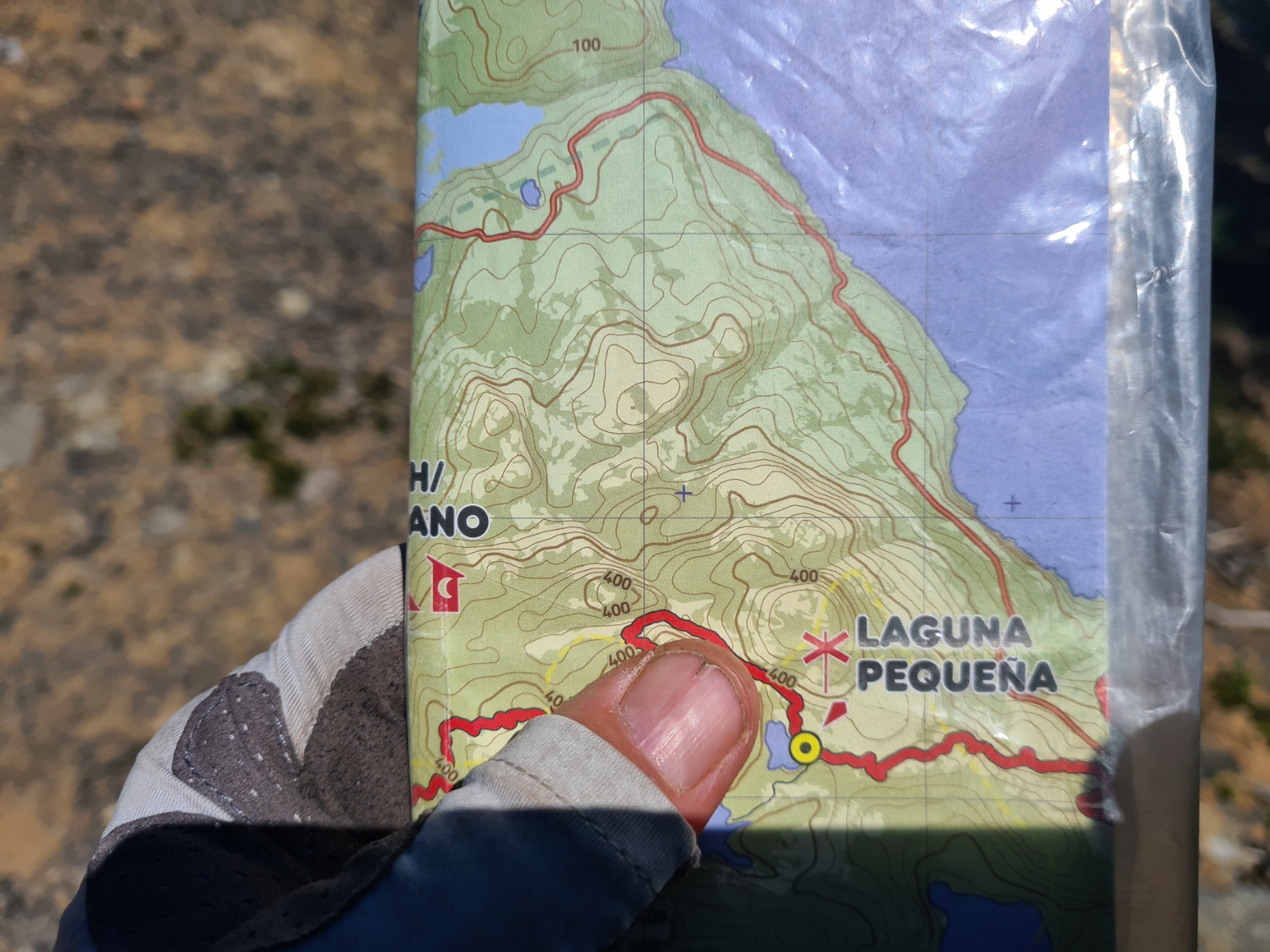 I knew there was a long descent to the finish, and for that to happen there had to be an equivalent amount of climbing today. The 100m contours on the map hide a lot of the actual ascents/descents on the ground. The helpful topographic map provided isn’t the best and a couple of quite large lakes I passed are not even shown.