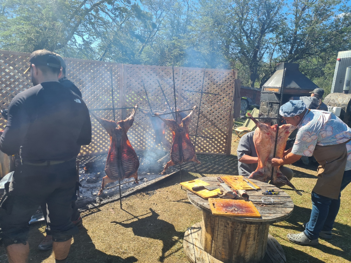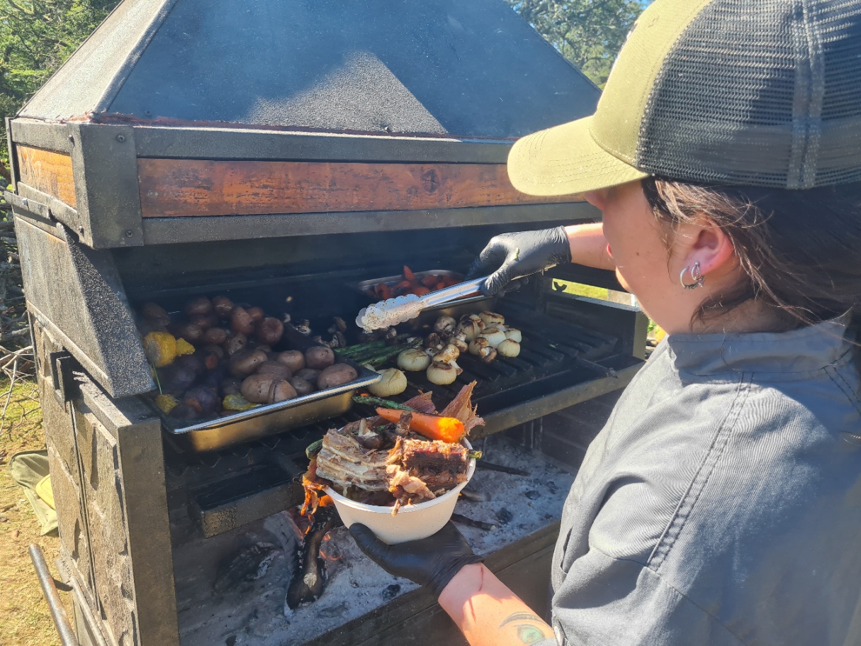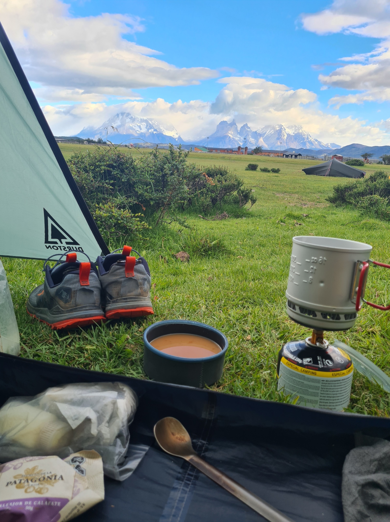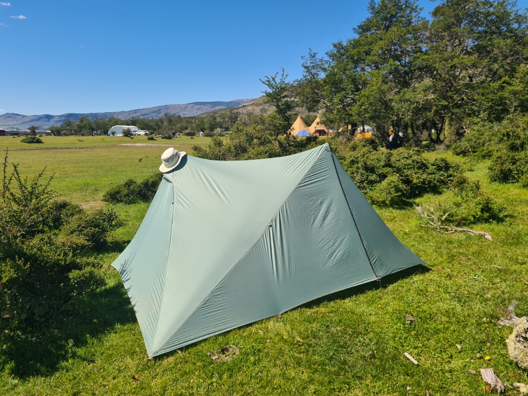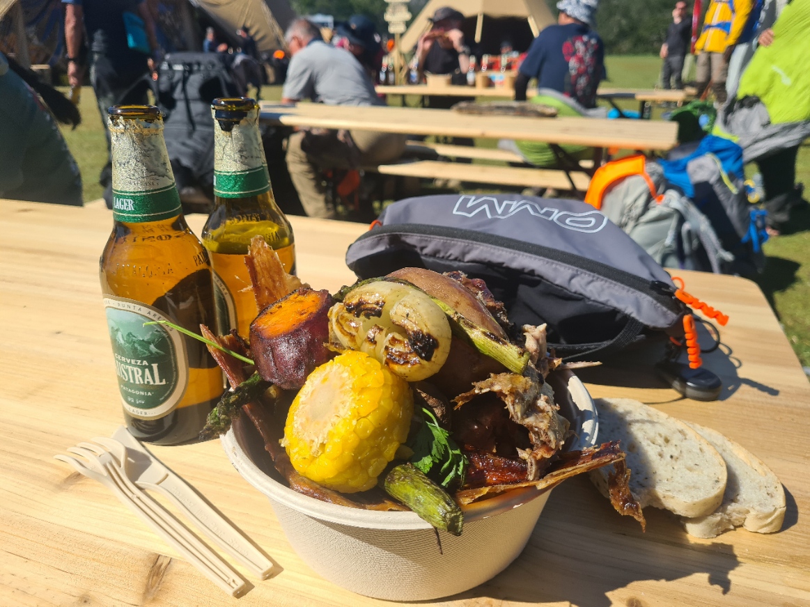 There was a lot of space at this final camp and I pitched right on the edge of the forest line, with a grand view of the Paine Massif in the distance, across the Serrano delta. I was hot and sweaty so had a bit of a wipe down tent wash before changing into clean skiddies, shorts, clean shirt, Sealskinz inside my grotty shoes and then walked back to the checkpoint camp for beers and to collect my pre-ordered lamb BBQ.