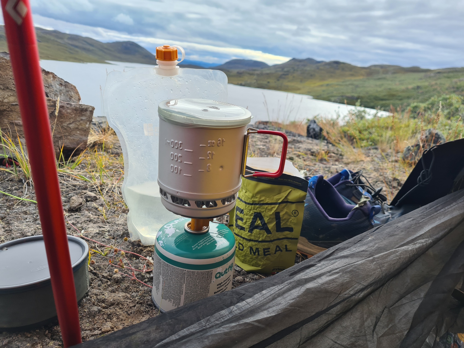 Evernew bottle acts as a windbreak for the stove. Arctic Circle Trail, Greenland