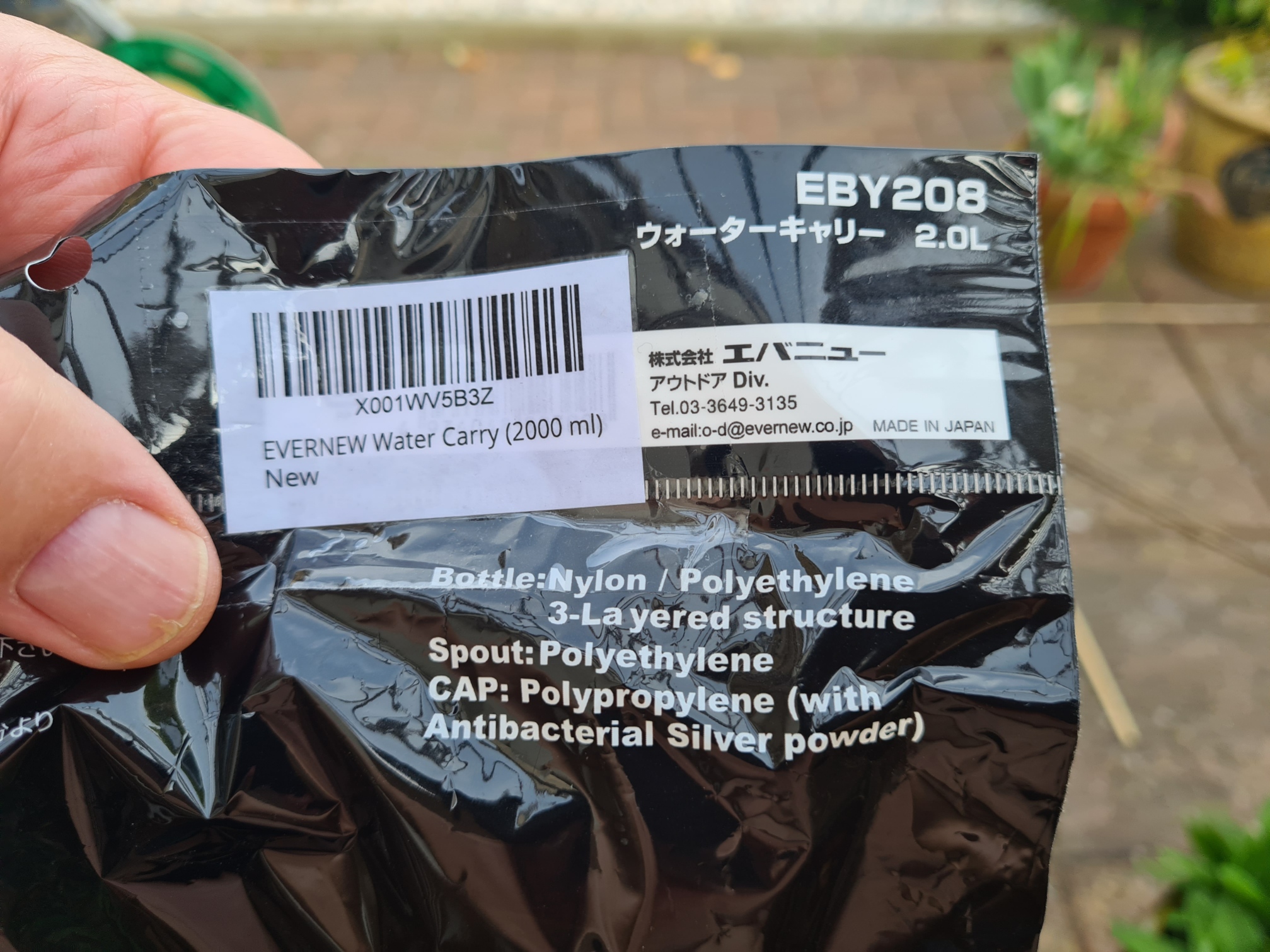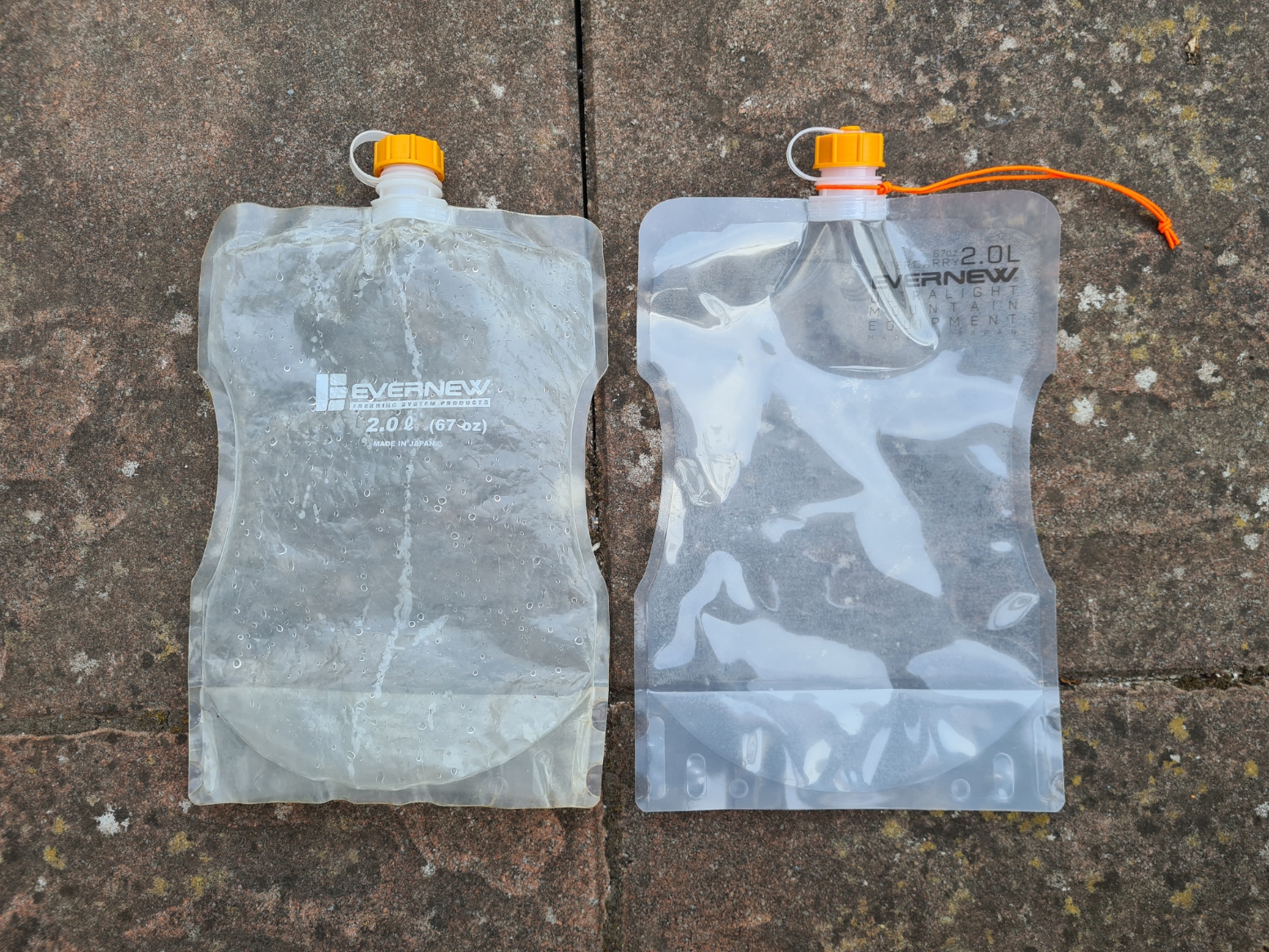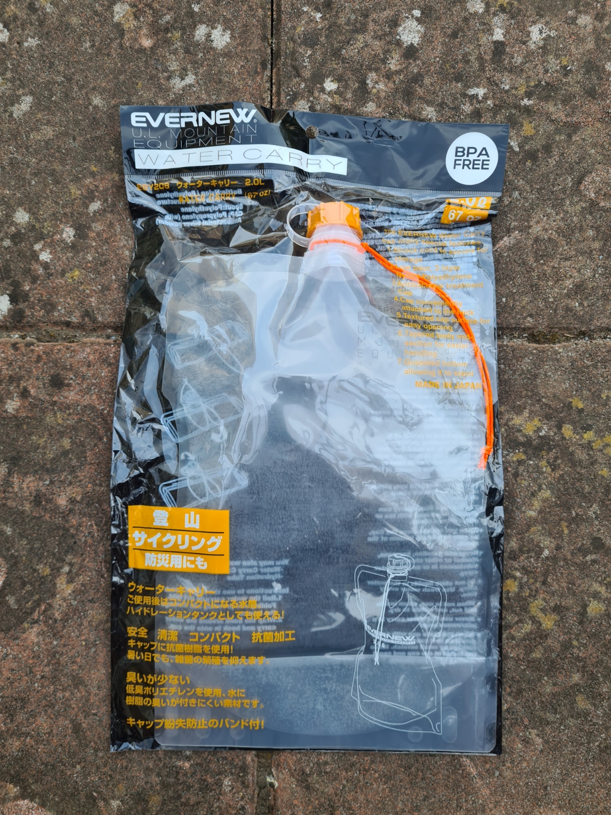 This is my clean water container. The one that has potable and filtered water poured into. It doesn’t taint the water with that plasticky taste that so many other containers do. I use another container for dirty water. I tried the Cnoc containers that everyone seems to like but didn’t get on with it, preferring the HydraPak Seeker bladders instead. As to drinking water container on-the-go, that is simply any old Smartwater or similar water bottle. The Evernew is usually my camp container, perhaps filled up at some point in the afternoon approaching a nights halt, or one of the first chores to complete once the tent is up. Collect the water for the night and morning.
