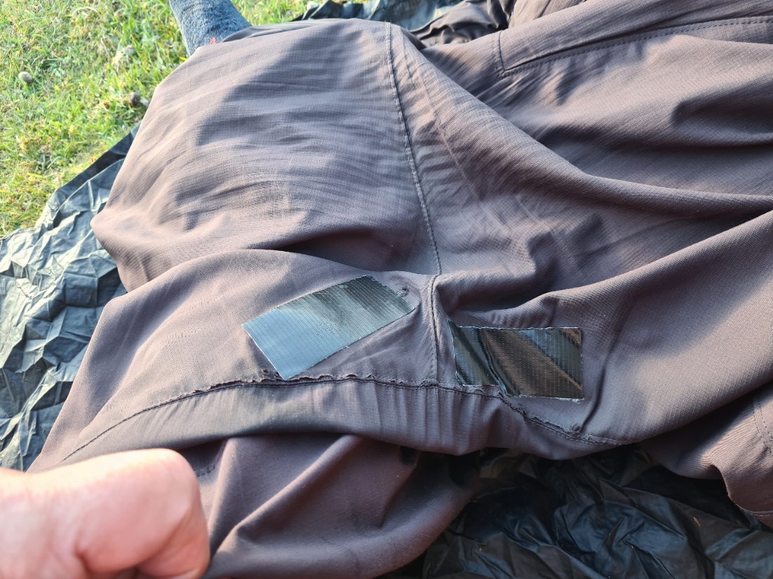 So, almost in sympathy with my hiking top wearing out, my hiking trousers also wore through. I often wear Patagonia Terrebonne Joggers. They are only 185g but this weight is achieved by using lightweight materials. Unsurprisingly, this will eventually wear out. It has taken a few hikes but pulling them off one night I saw the material had worn through at the rear. I suspect from constant abrasion from the pack. Again, duct tape to the rescue. Again, they were thrown away at the end of the hike and I already had a replacement waiting at home.